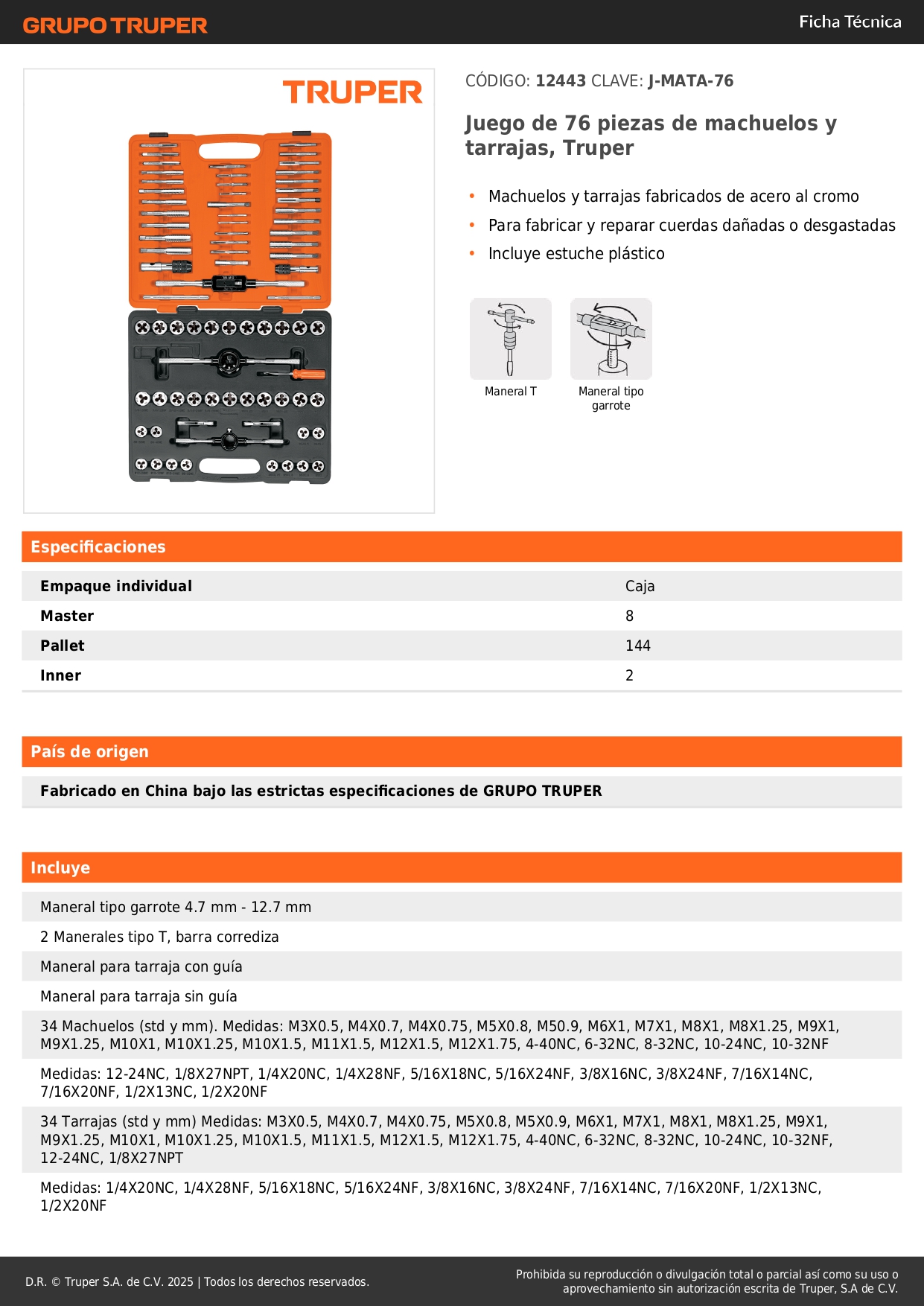 Medidas: 1/4X20NC, 1/4X28NF, 5/16X18NC, 5/16X24NF, 3/8X16NC, 3/8X24NF, 7/16X14NC, 7/16X20NF, 1/2X13NC,
