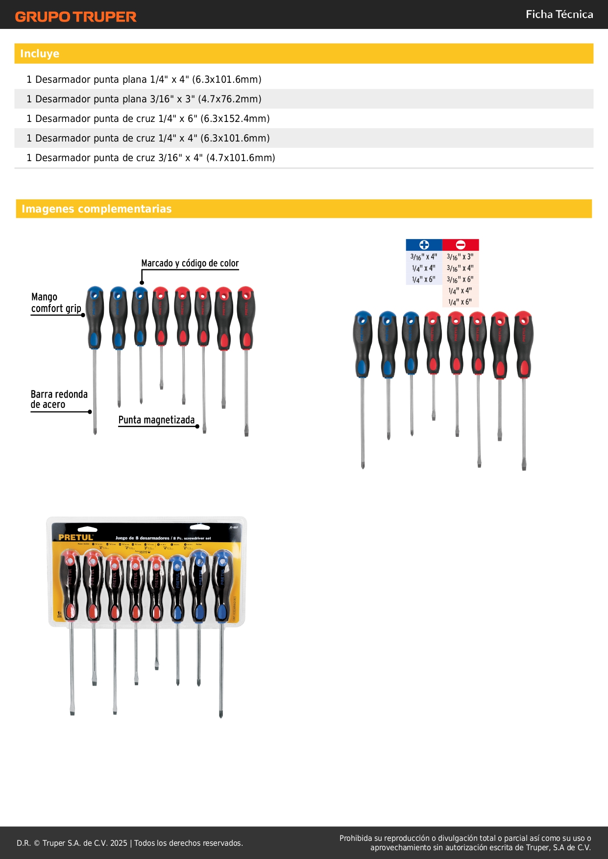 - 1 Desarmador de cruz de 1/4" x 6" (6.3x152.4mm).