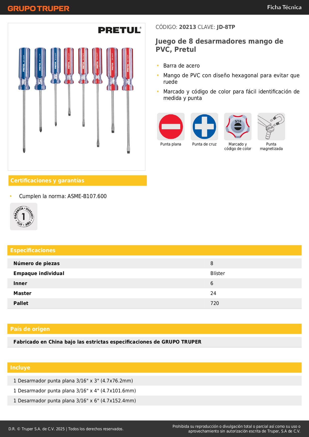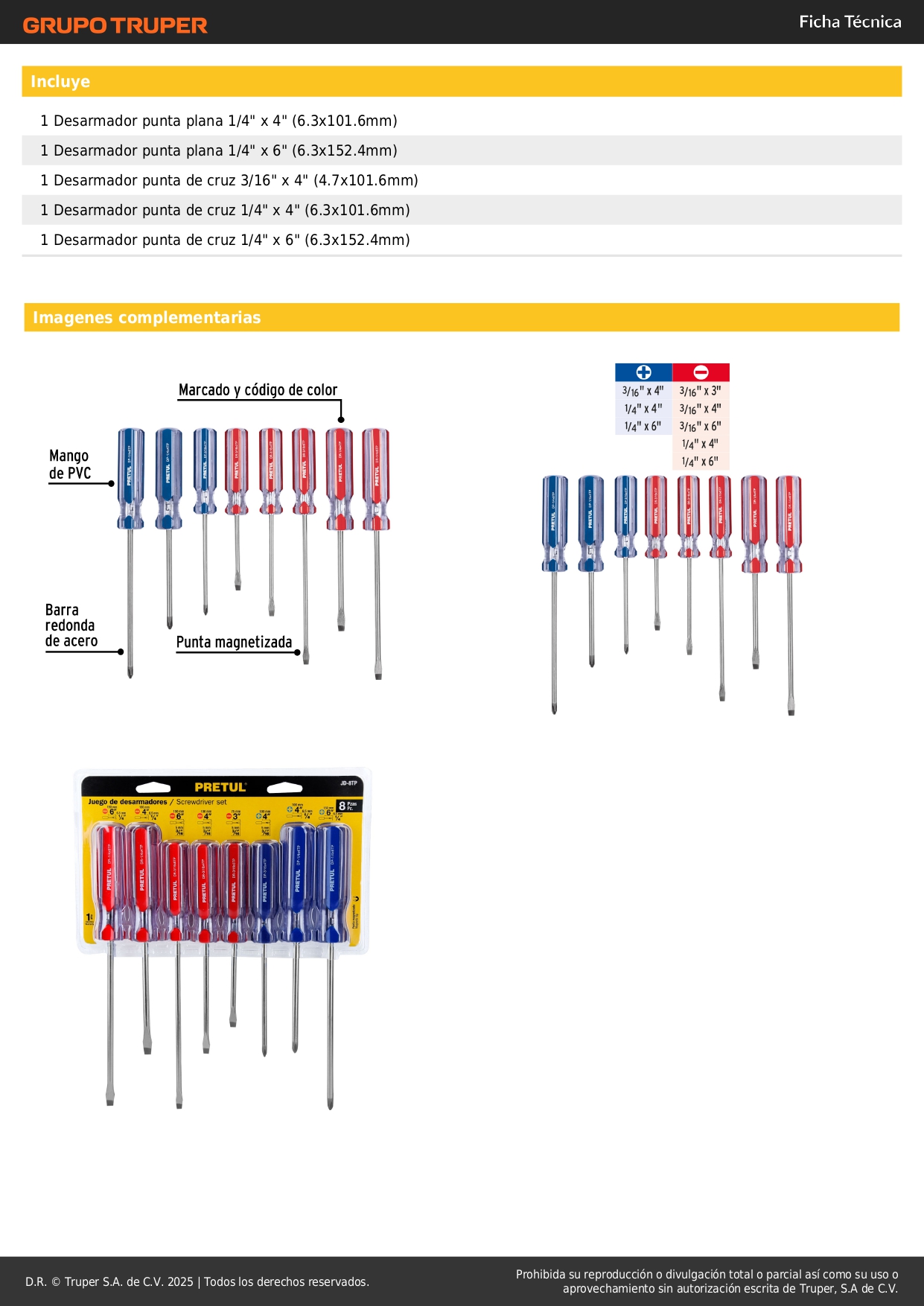 - 1 Desarmador de cruz de 1/4" x 6" (6.3x152.4mm).