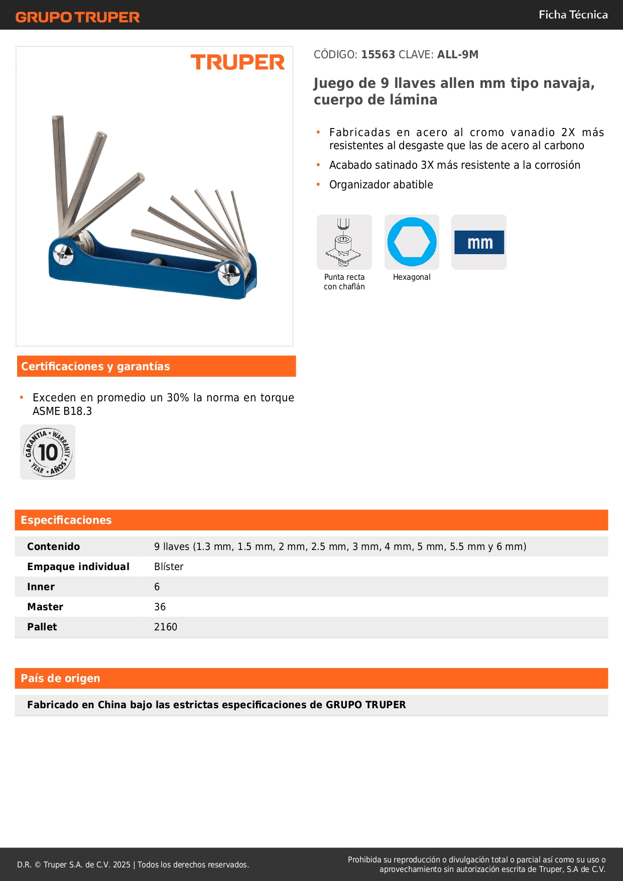 Juego de 9 llaves Allen tipo navaja Truper Stock por sucursal Stock por sucursal S/ 15.00 cantidad Agregar al carro Avísame cuando llegue Fabricadas en acero al cromo vanadio 2x más resistentes al desgaste.