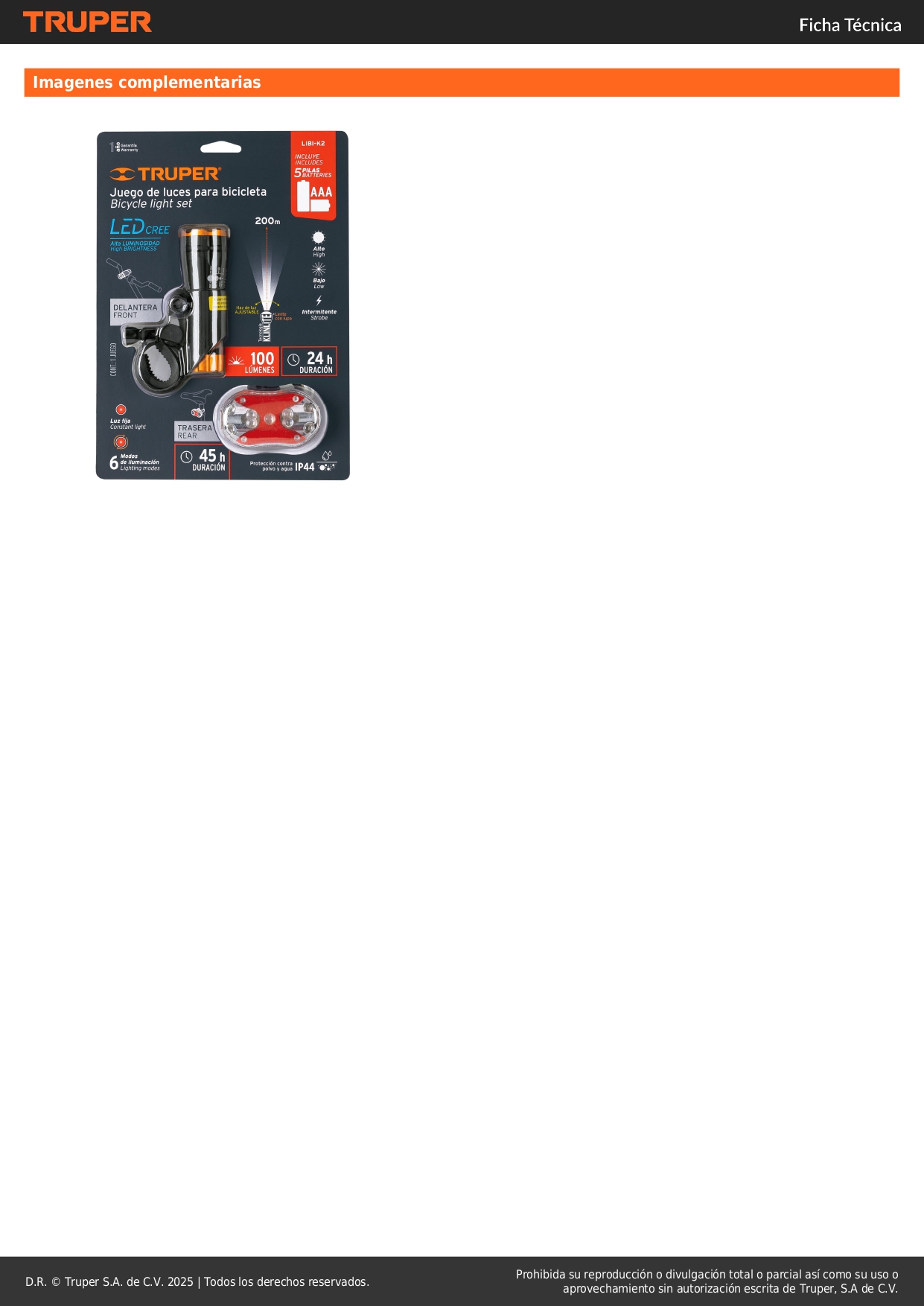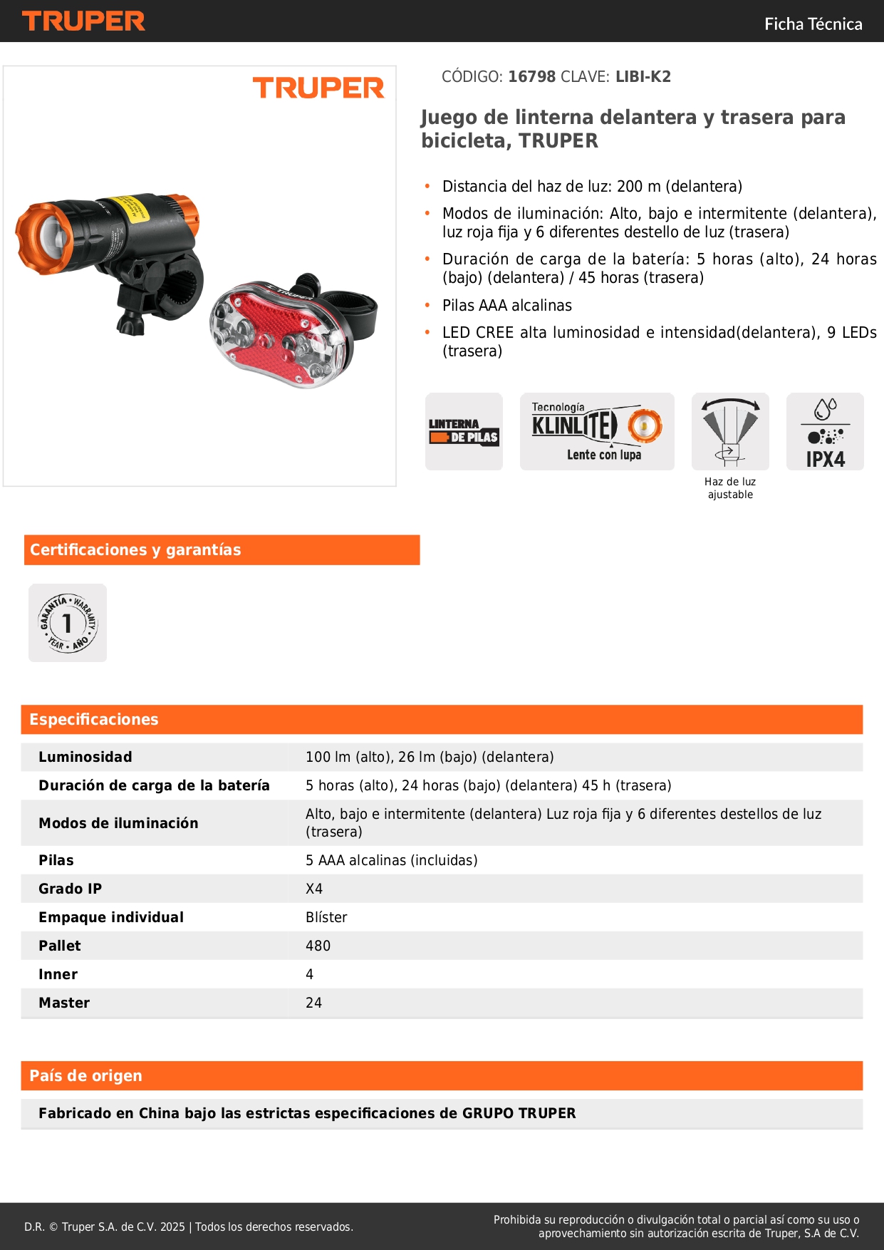 • Modos de iluminación: Alto, bajo e intermitente (delantera), luz roja fija y 6 diferentes destello de luz (trasera)