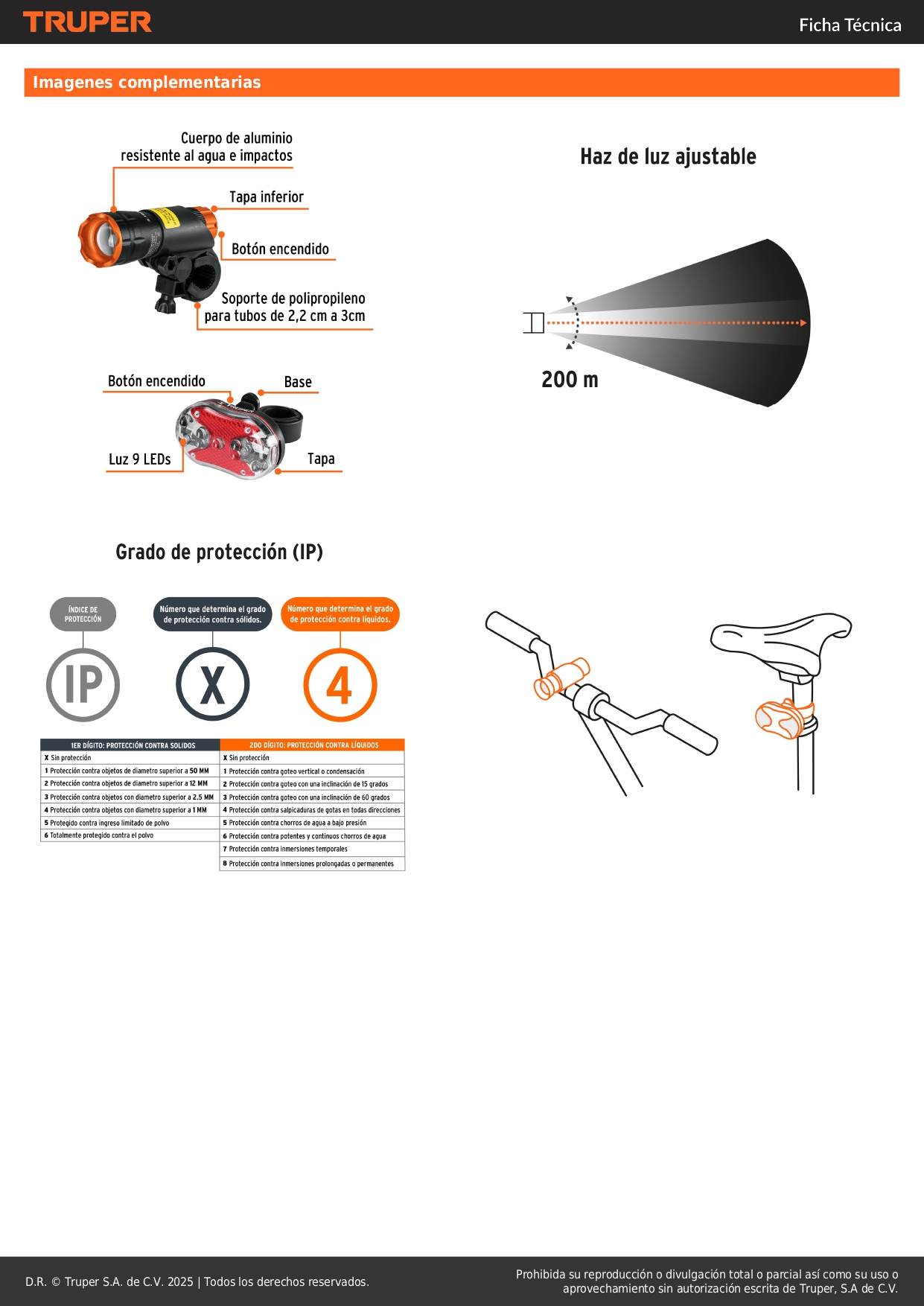 Modos de iluminación Alto, bajo e intermitente (delantera) Luz roja fija y 6 diferentes destellos de luz