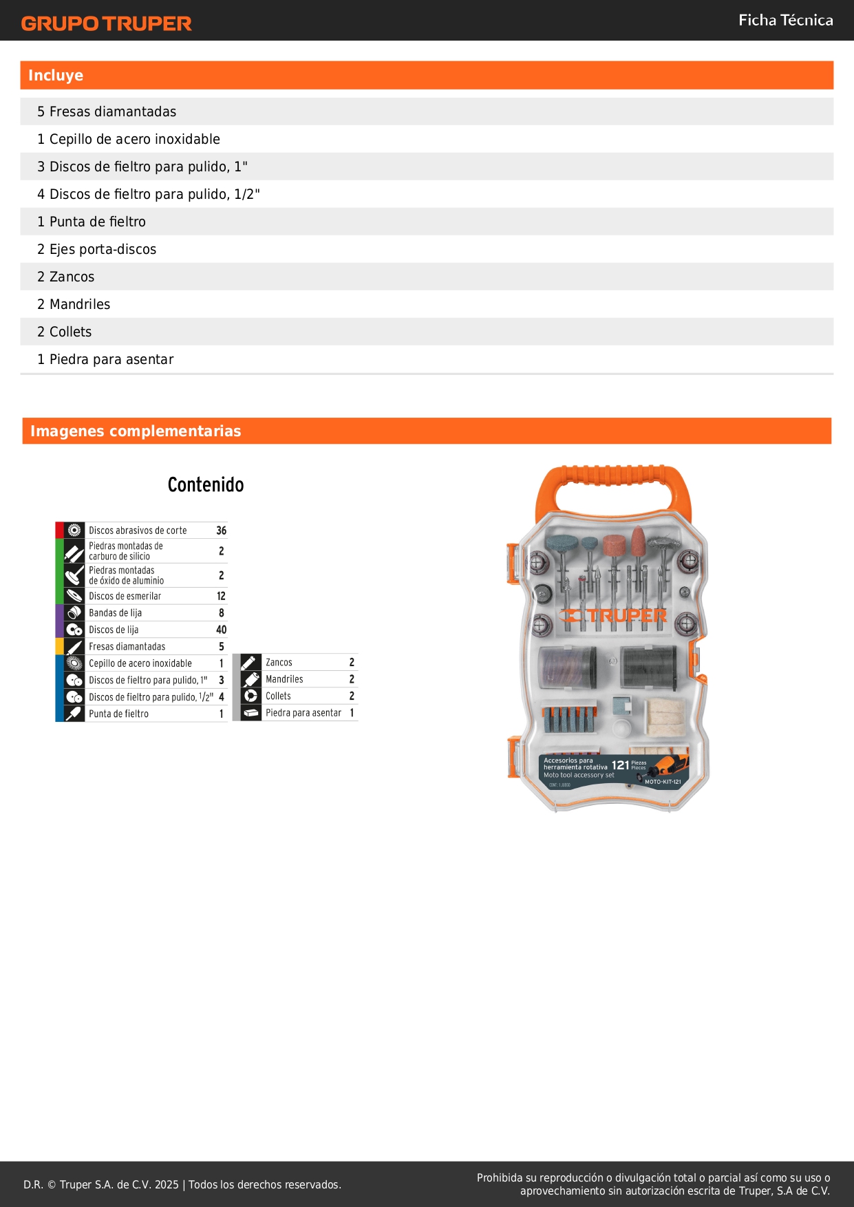 Kit de accesorios p/herramienta rotativa, 121 pzs, TRUPER