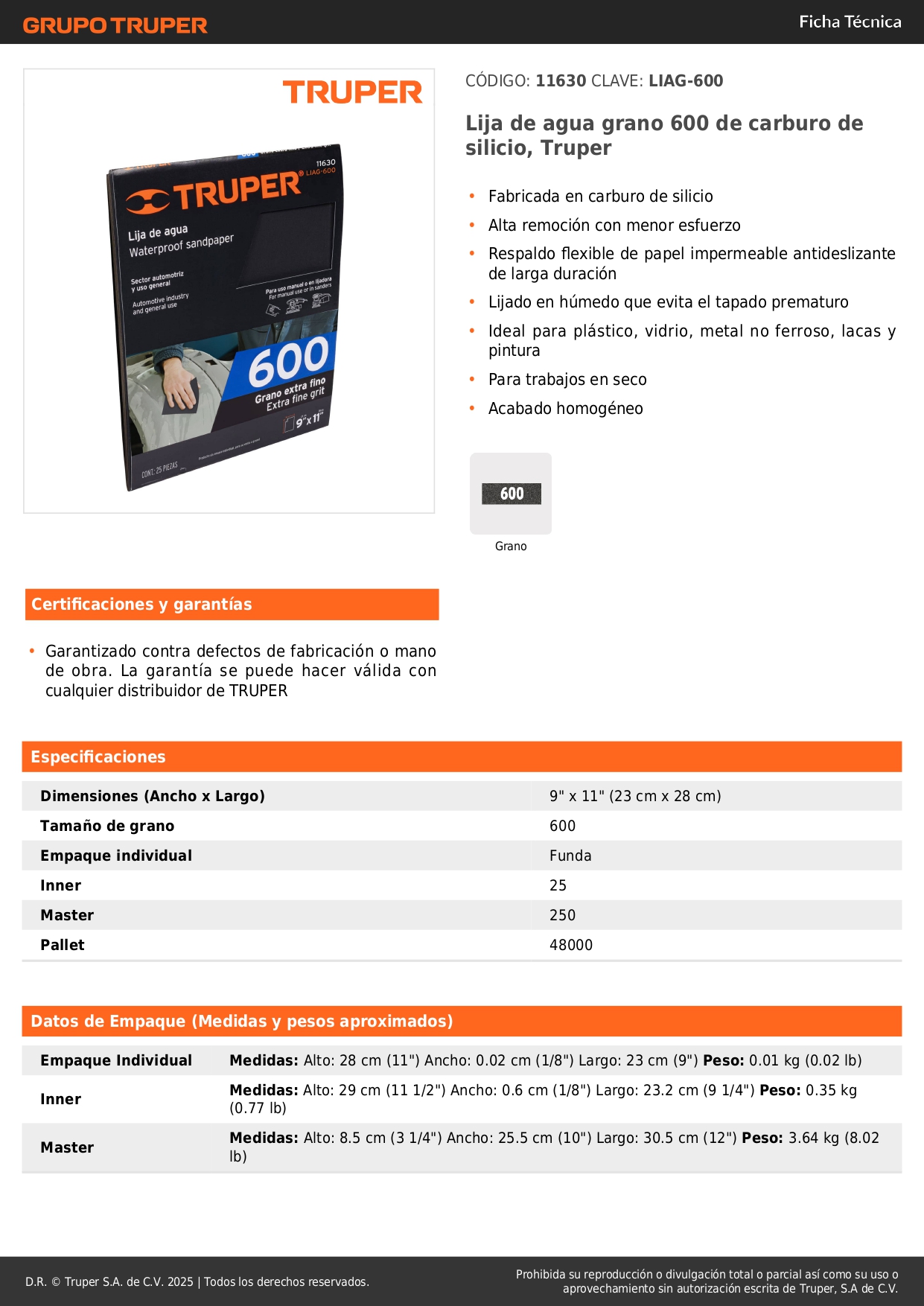 Lija de agua grano 600 de carburo de silicio, por unidad, Truper
