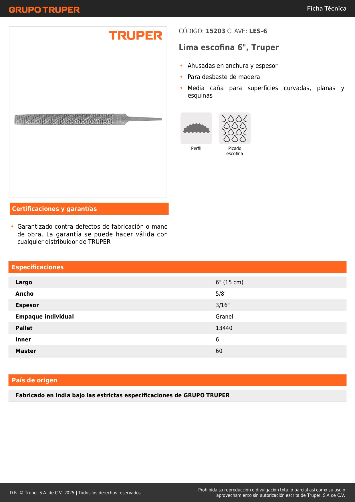 Lima escofina 6'' Truper Stock por sucursal Stock por sucursal S/ 10.70 cantidad Agregar al carro Avísame cuando llegue -Ahusadas en anchura y espesor-Para desbaste de madera-Media caña para superficies curvadas, planas y esquinas