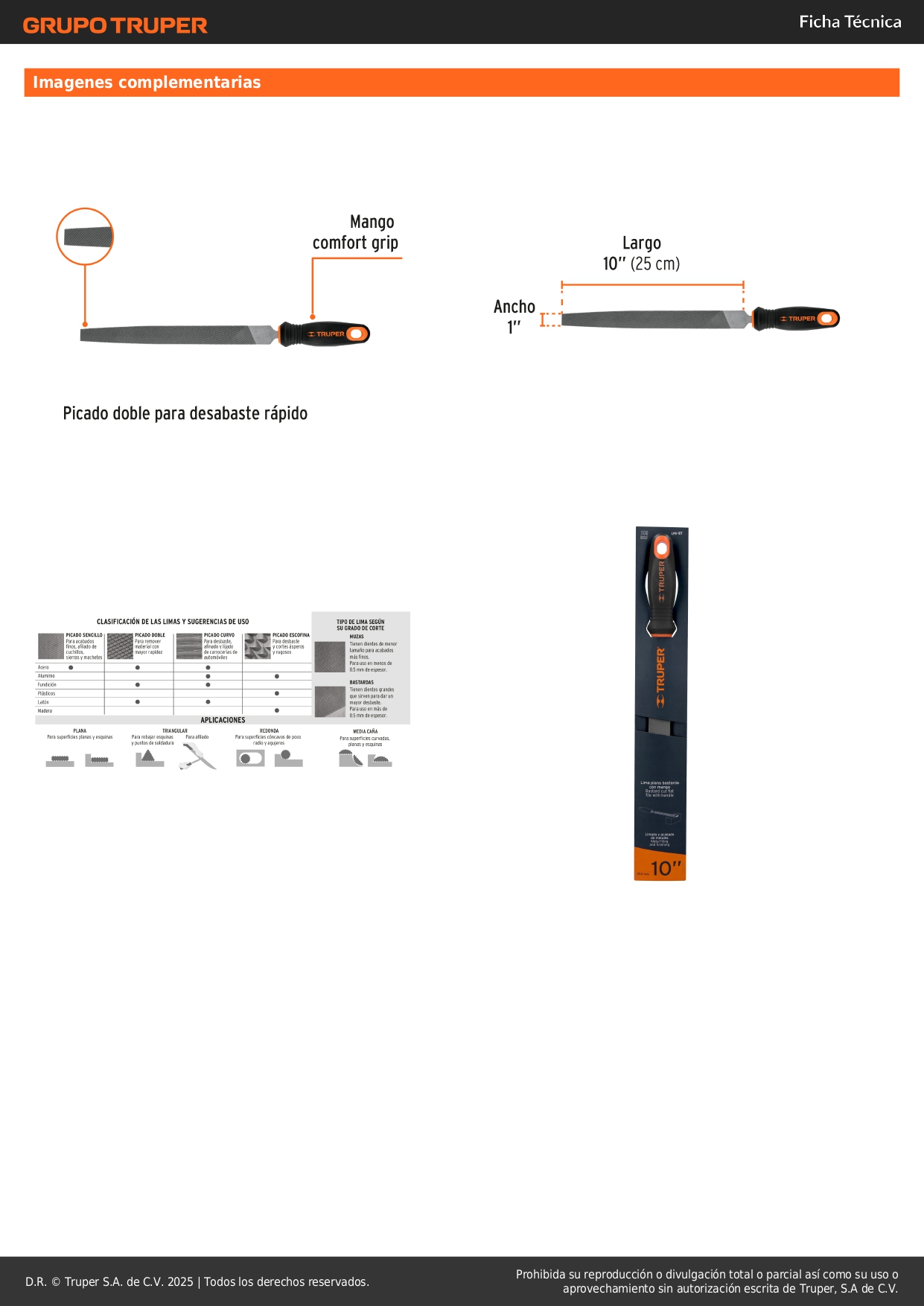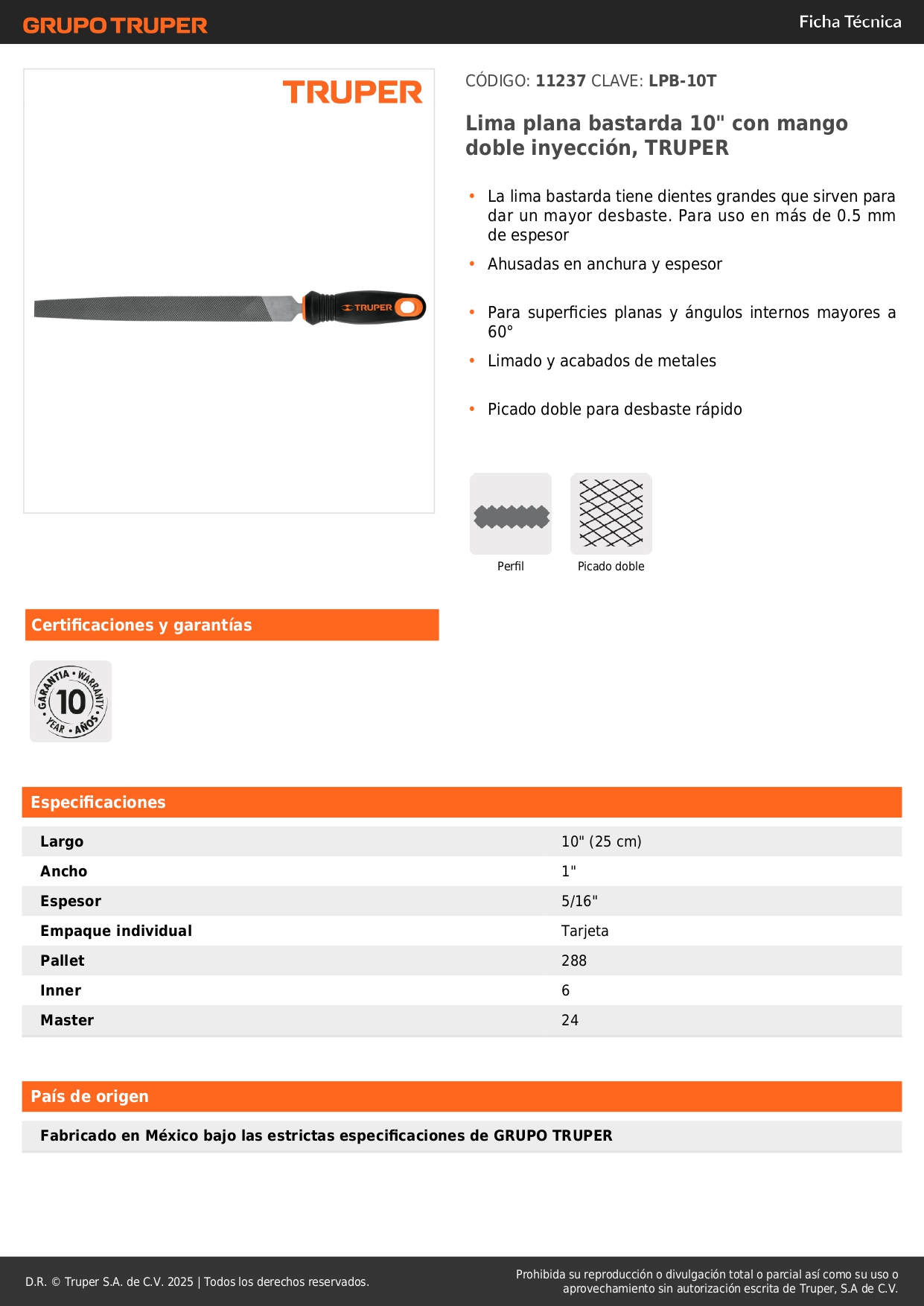 Lima plana bastarda 10'' con mango doble inyección. truper