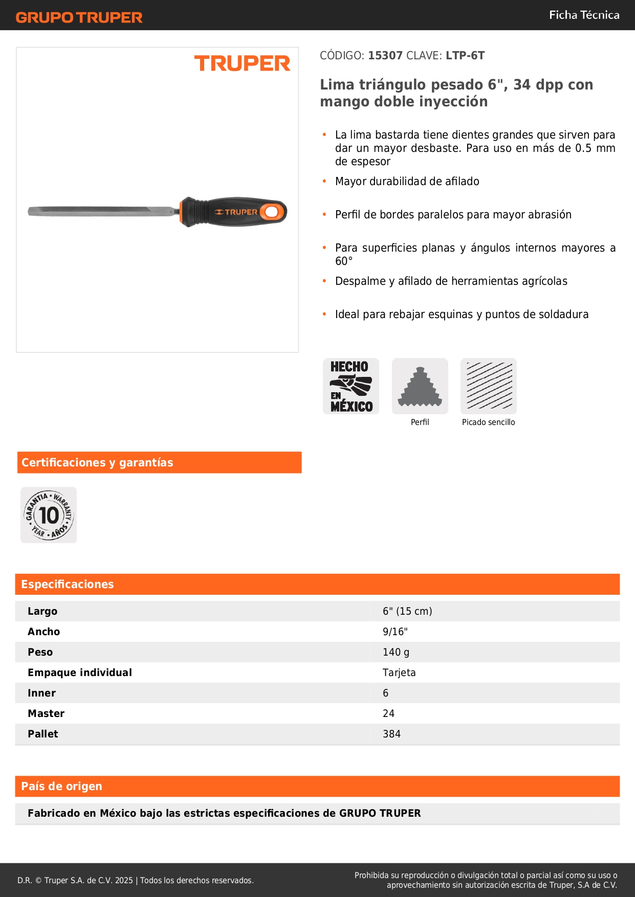 Lima triángulo pesado 6'' con mango doble inyección. truper