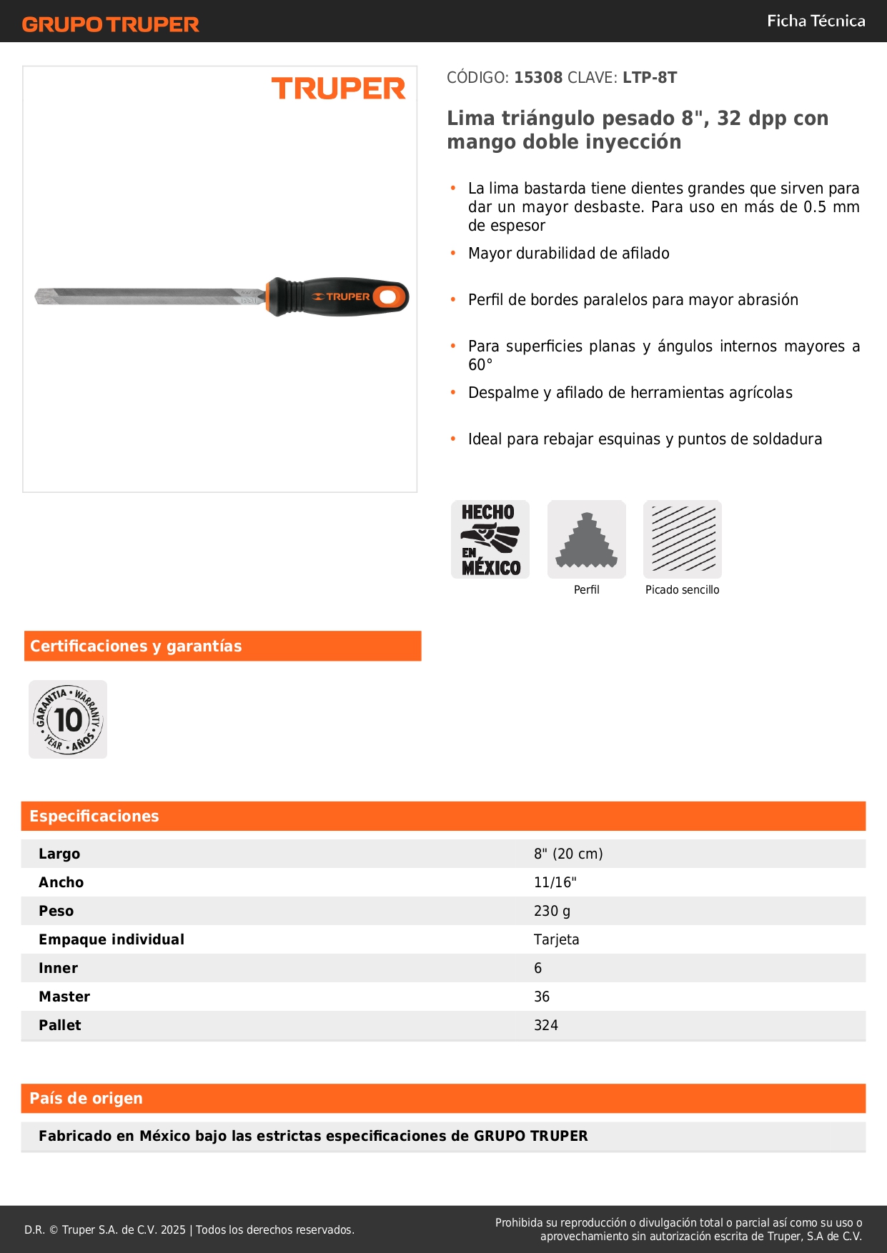 Lima triángulo pesado 8´´ con mango doble inyección, Truper