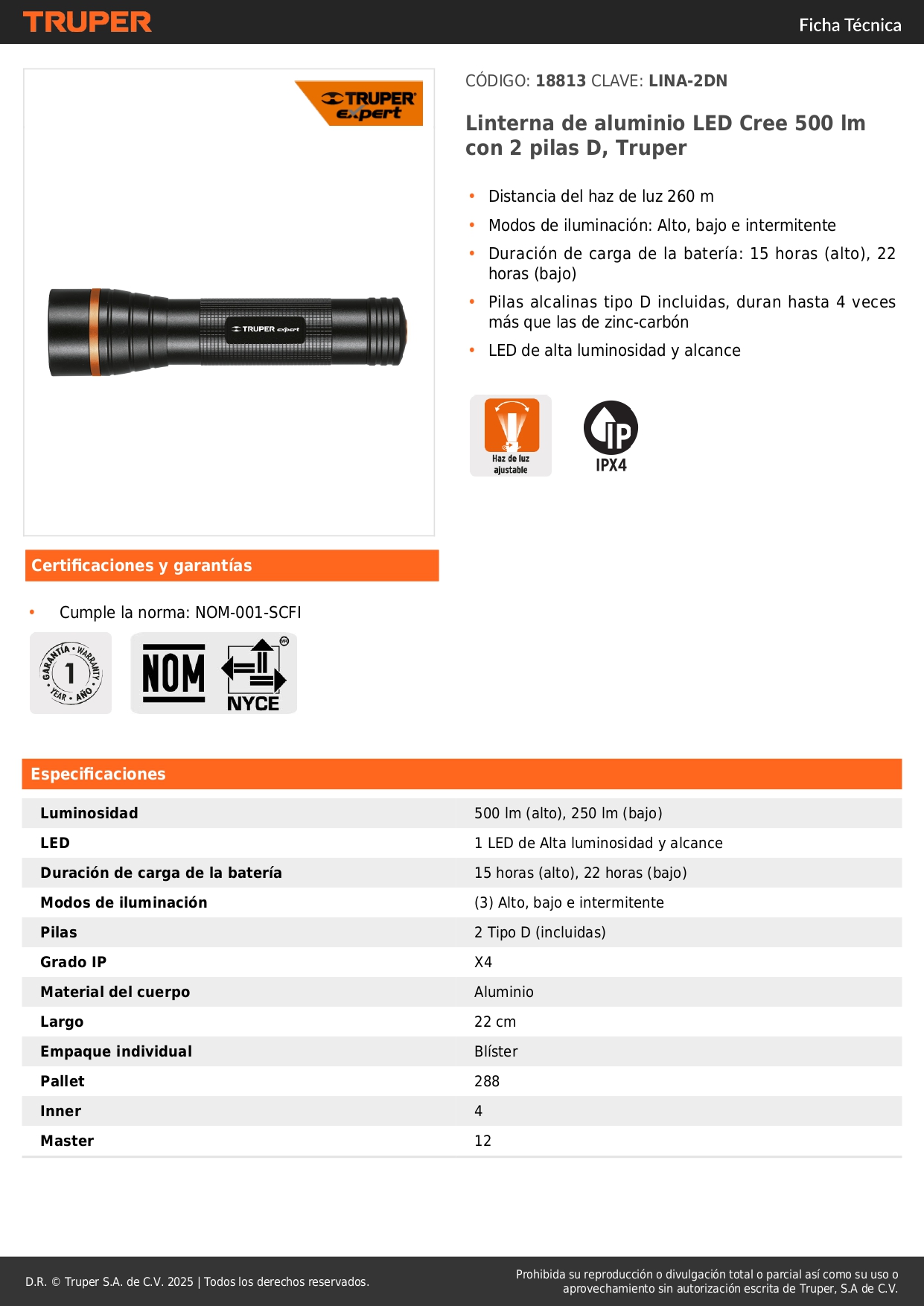 Linterna de aluminio led cree 500 lm con 2 pilas D Truper