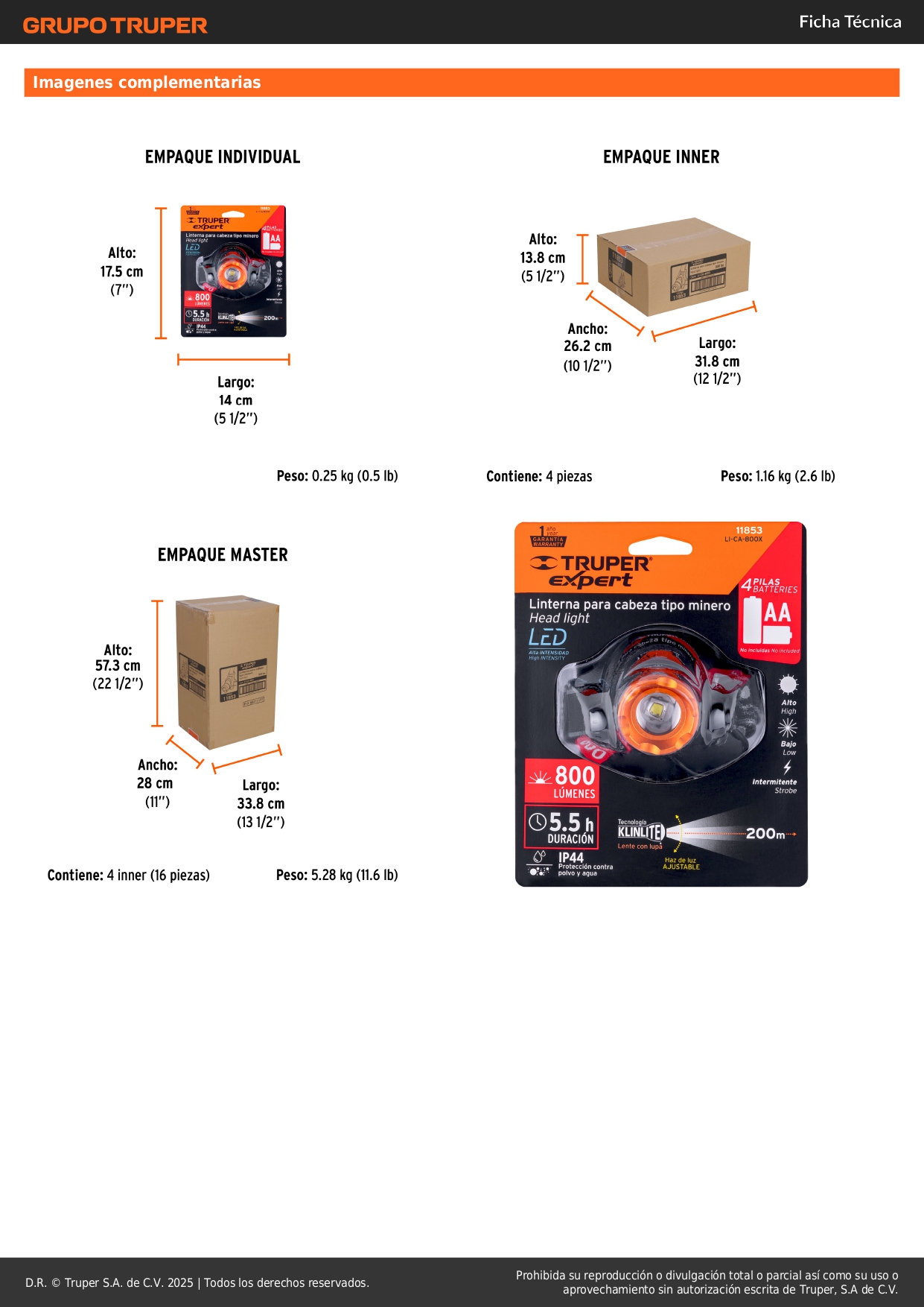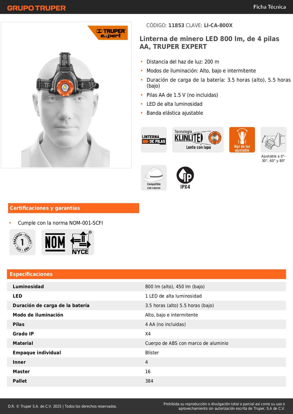 Linterna de cabeza 800 lm de 4 pilas AA Truper Expert