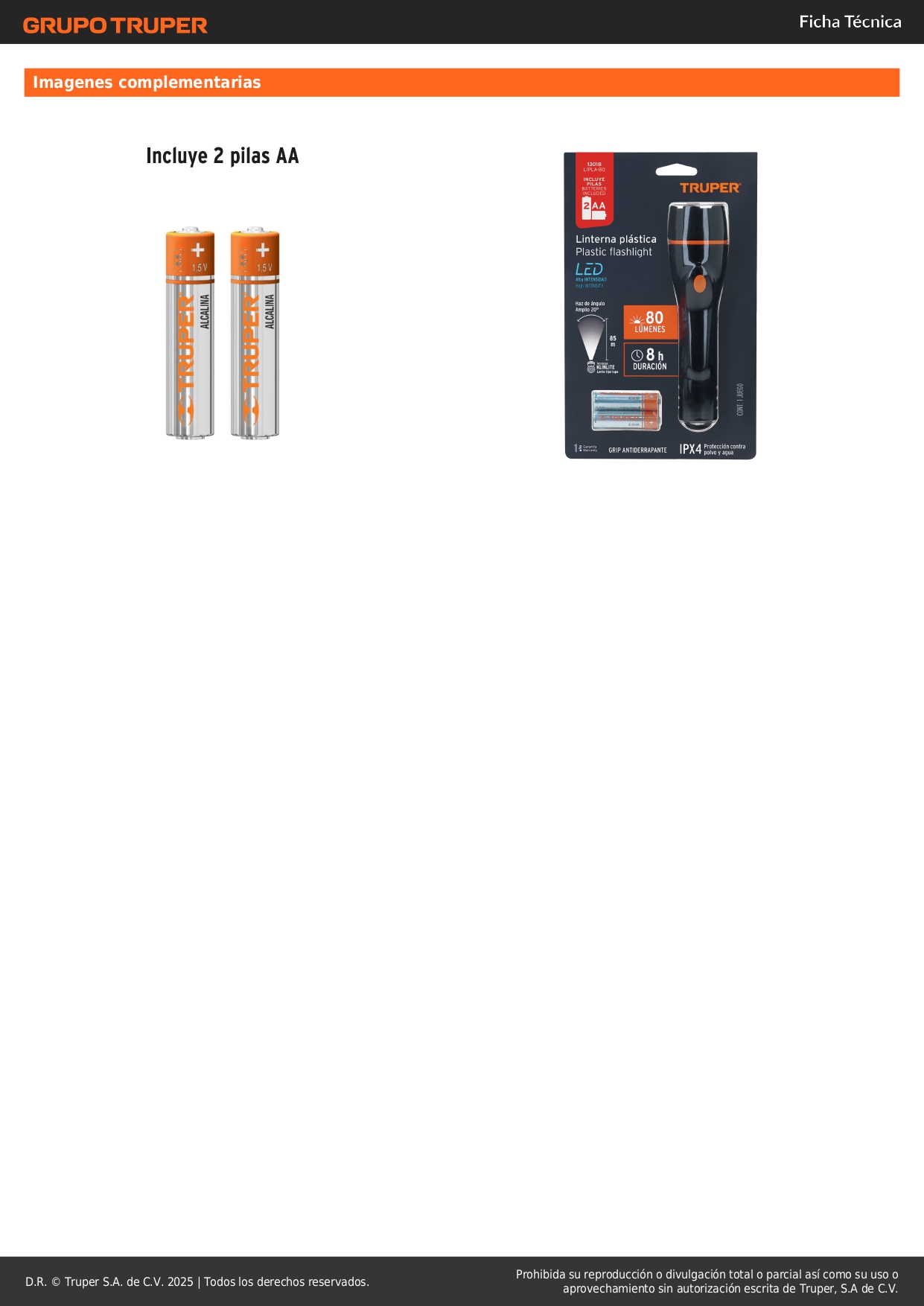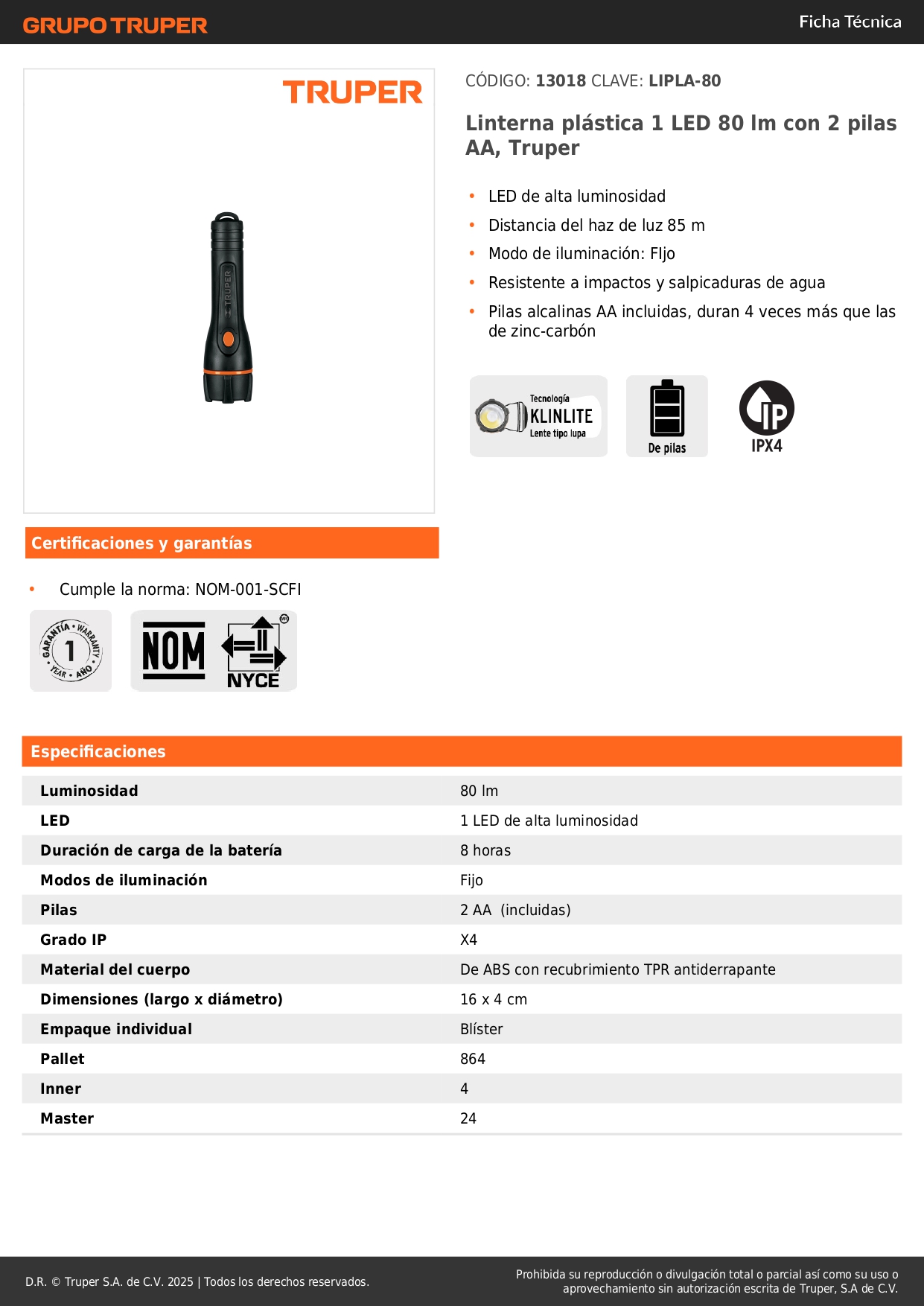 Linterna plástica 1 LED 80 lm con 2 pilas AA, Truper