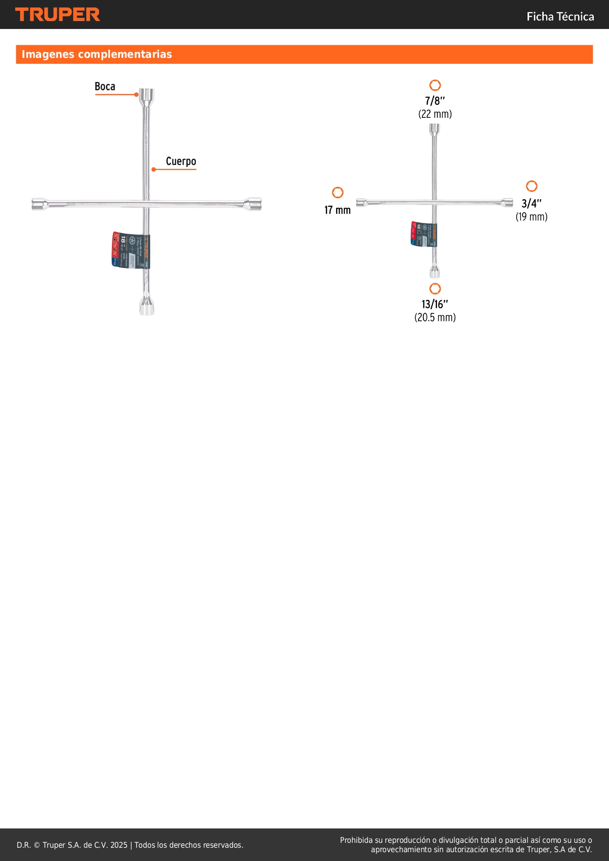 • Tamaño de bocas 17 mm, 3/4", 13/16", 7/8"