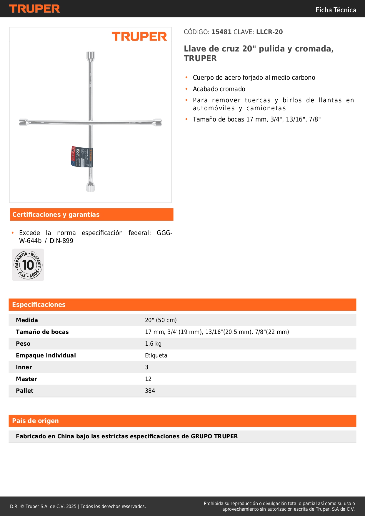 • Tamaño de bocas 17 mm, 3/4", 13/16", 7/8"