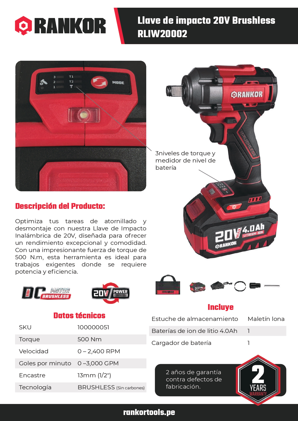 Llave de Impacto 500nm + Bateria y Cargador 20v Rankor