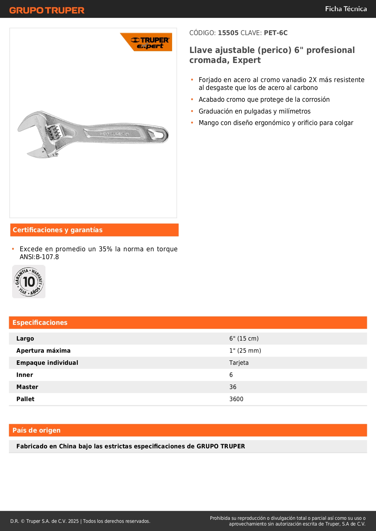 Llave francesa 6'' profesional cromada, Expert Truper