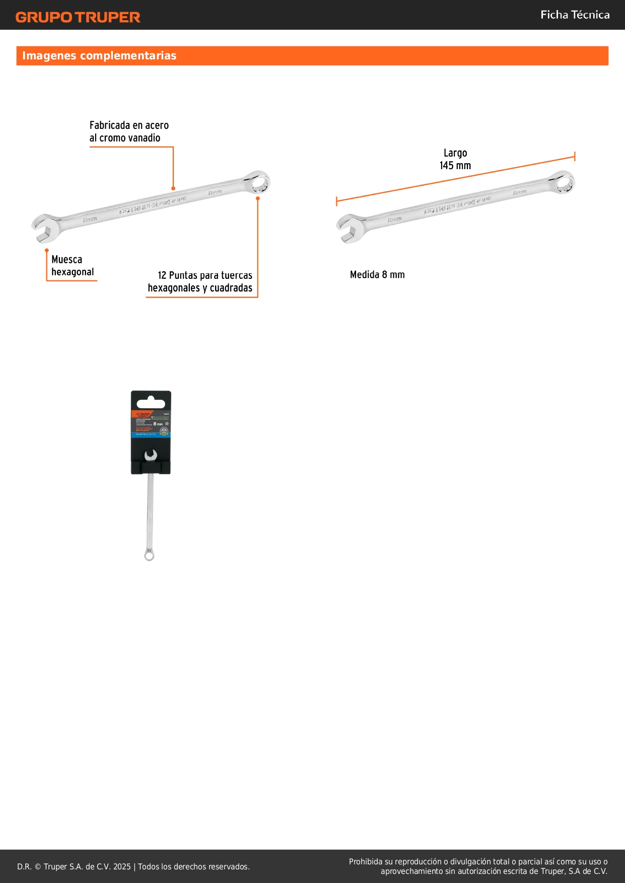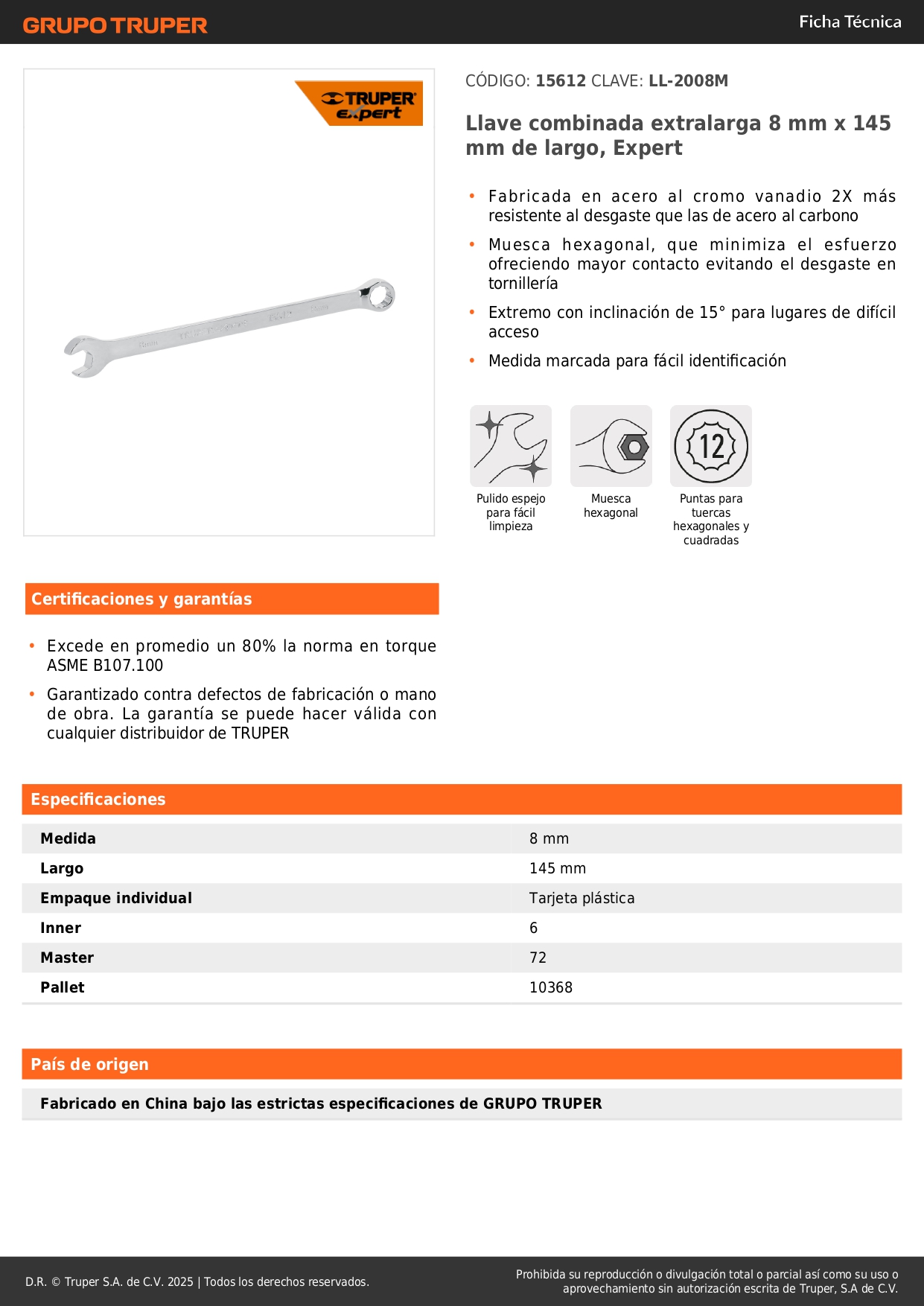 Llave mixta extralarga 8 mm x 145 mm de largo, Expert Truper