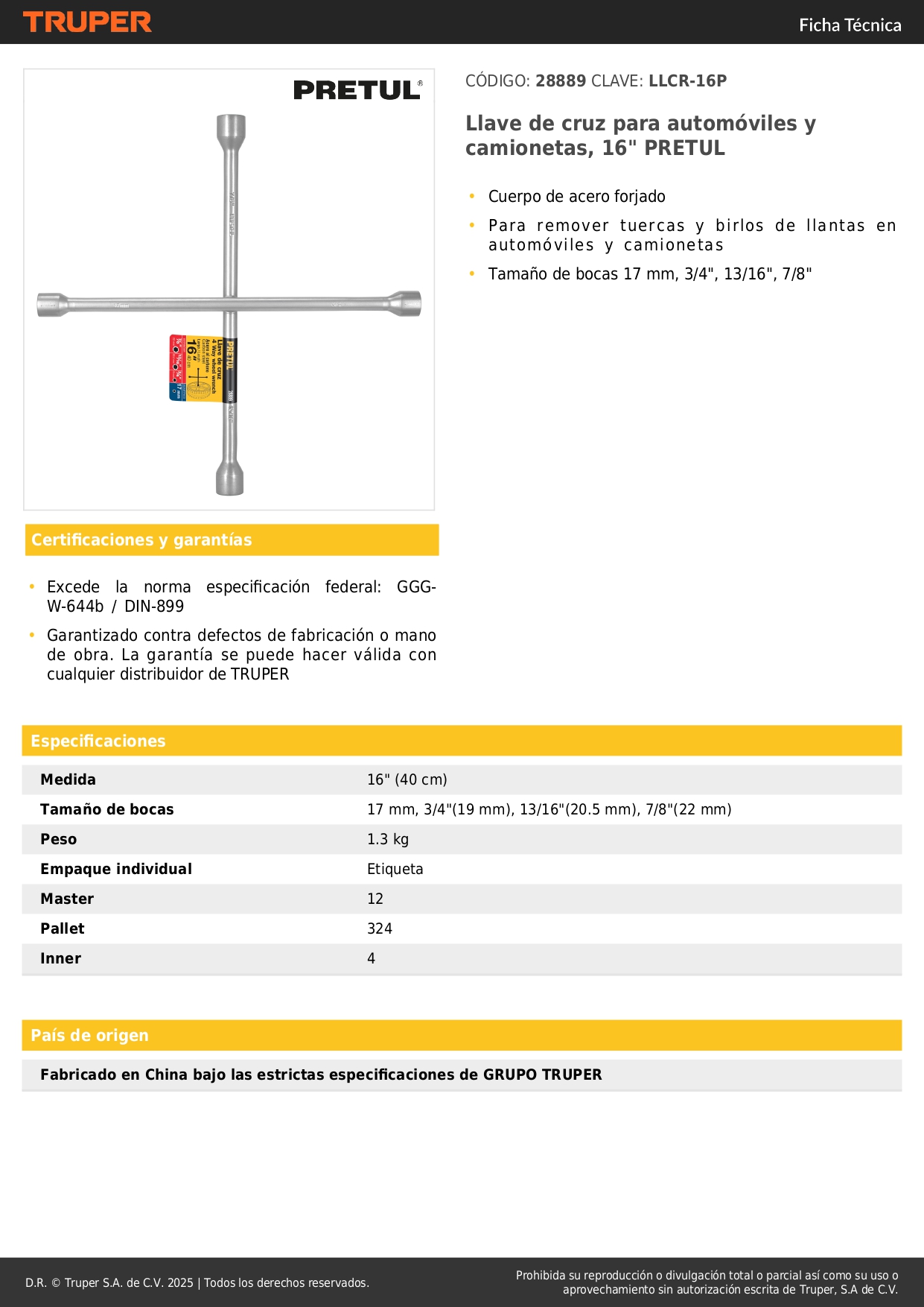 LLCR-16P Llave de cruz 16´´ galvanizada, Pretul