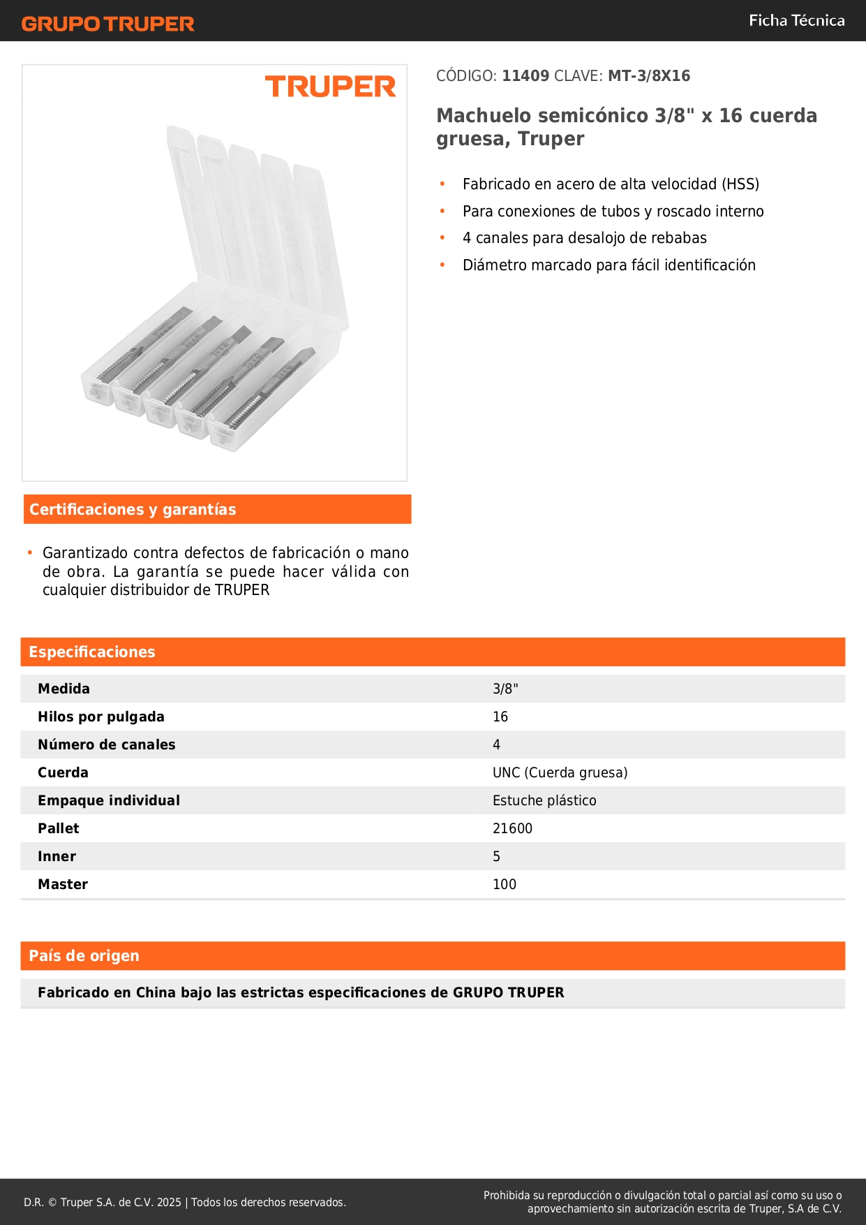 Macho semicónico 3/8´´ x 16 cuerda gruesa, Truper