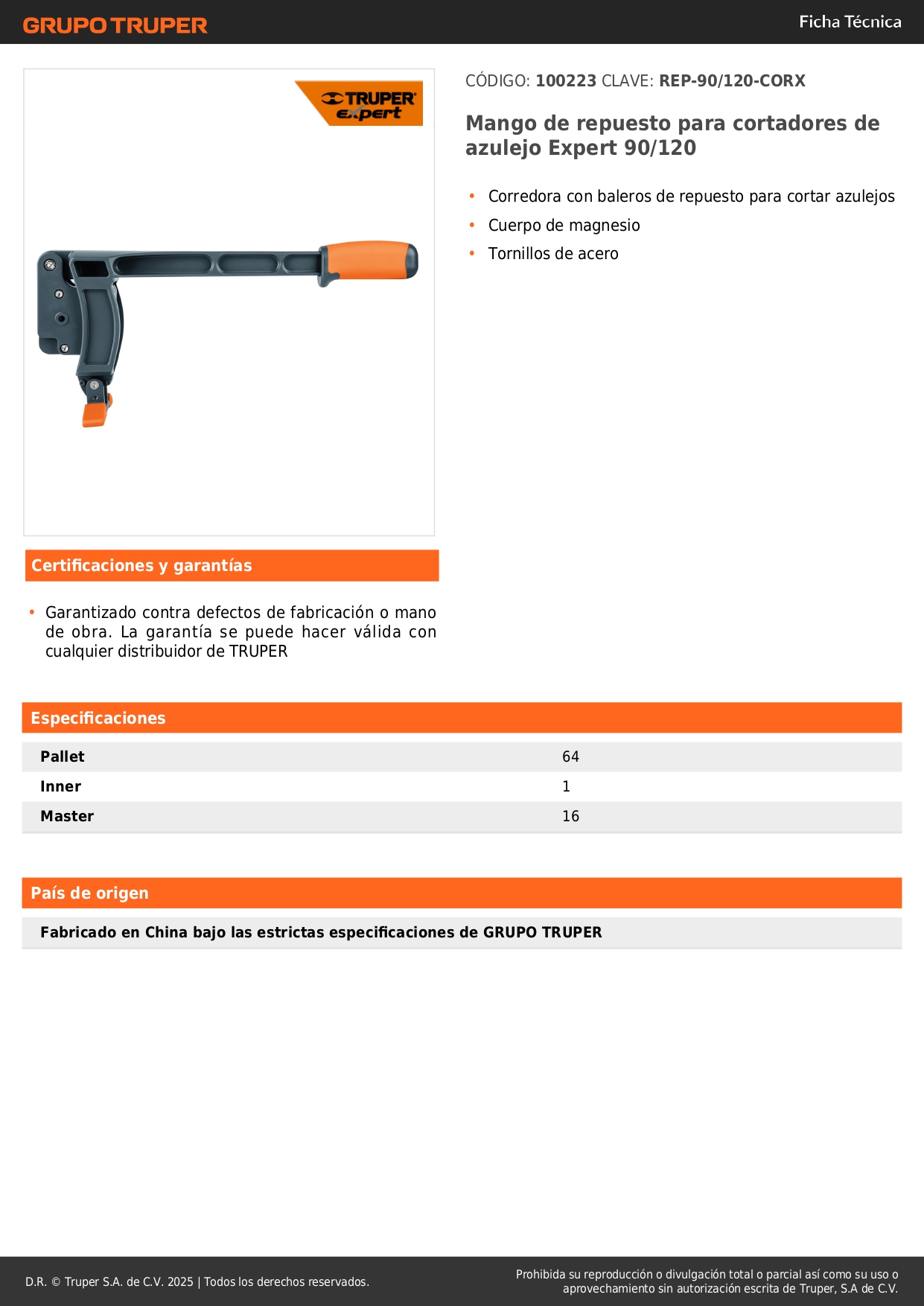 Mango de repuesto para cortapisos de mayólica Expert 90/120 Truper