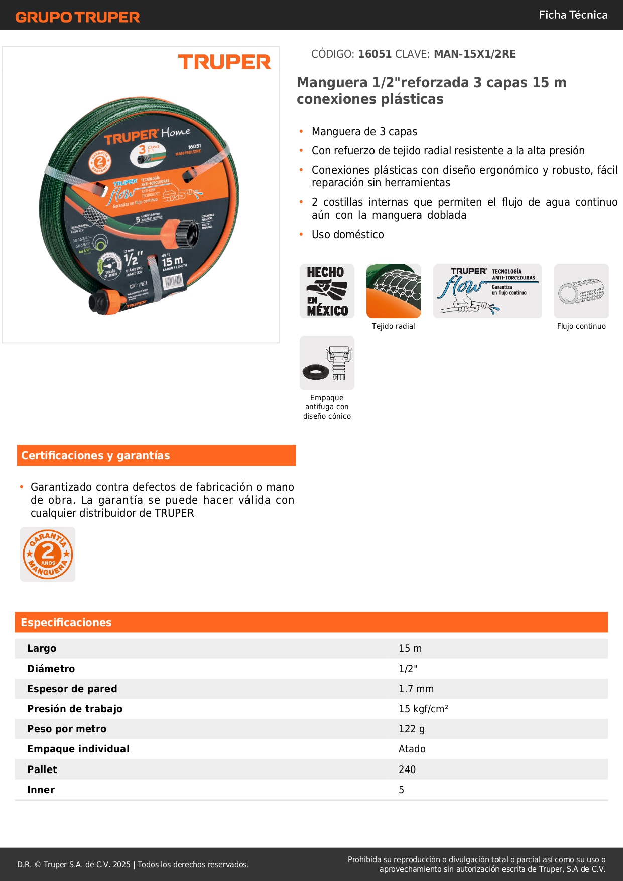 Manguera 1/2" reforzada 3 capas 15 metros Truper 16051
