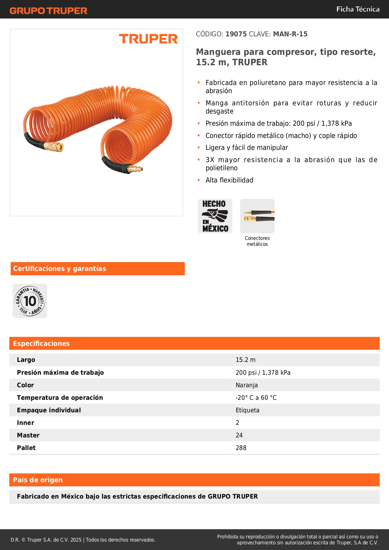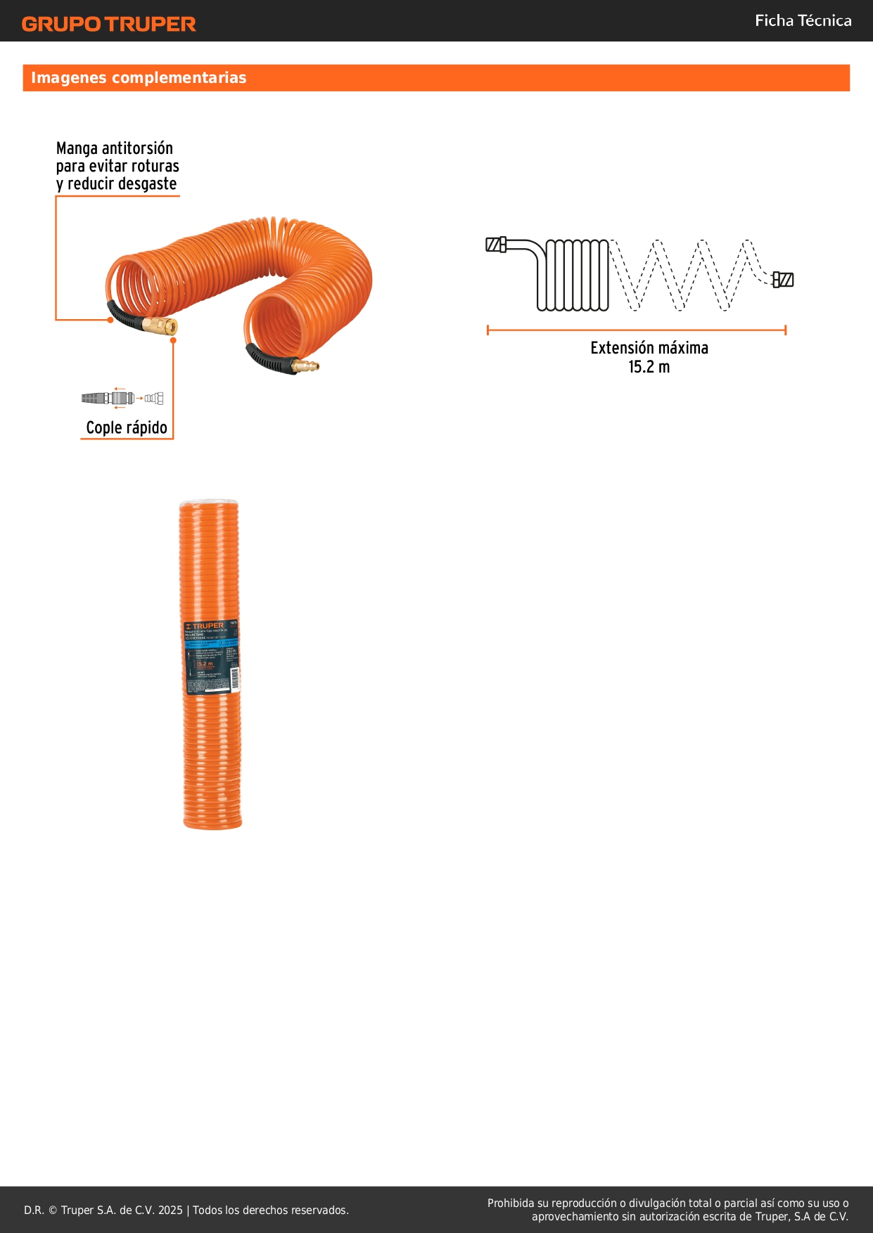 Manguera tipo resorte para compresor, 15 m x 1/4", Truper