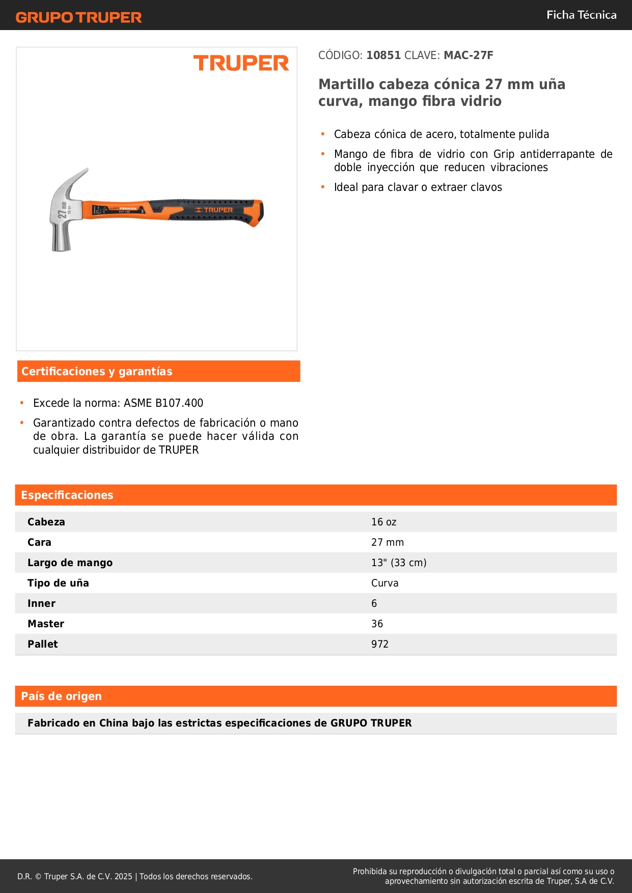 Martillo cabeza cónica 27 mm uña curva mango fibra vidrio Truper