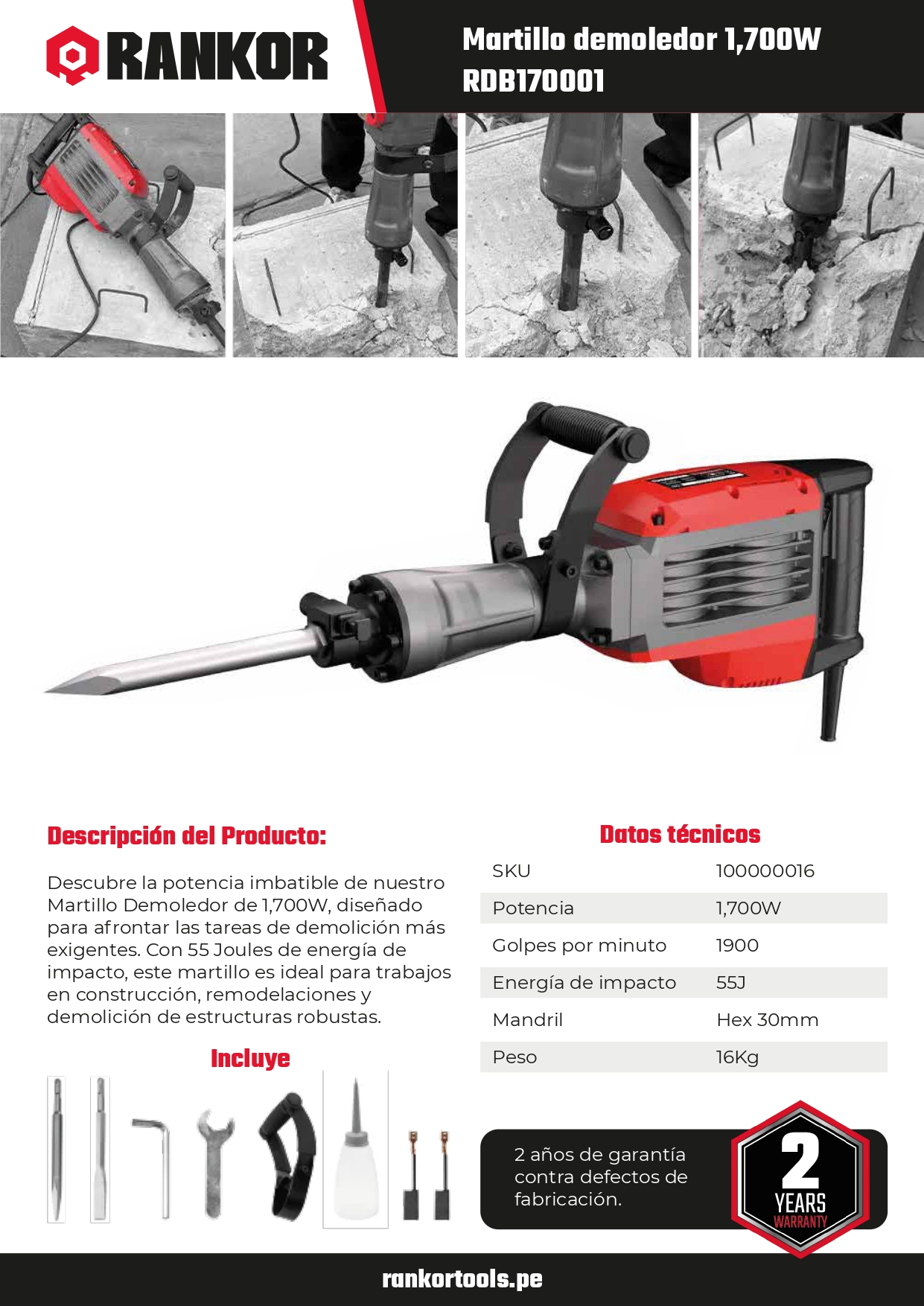 Martillo demoledor hexagonal 1700W 55 Joules Rankor