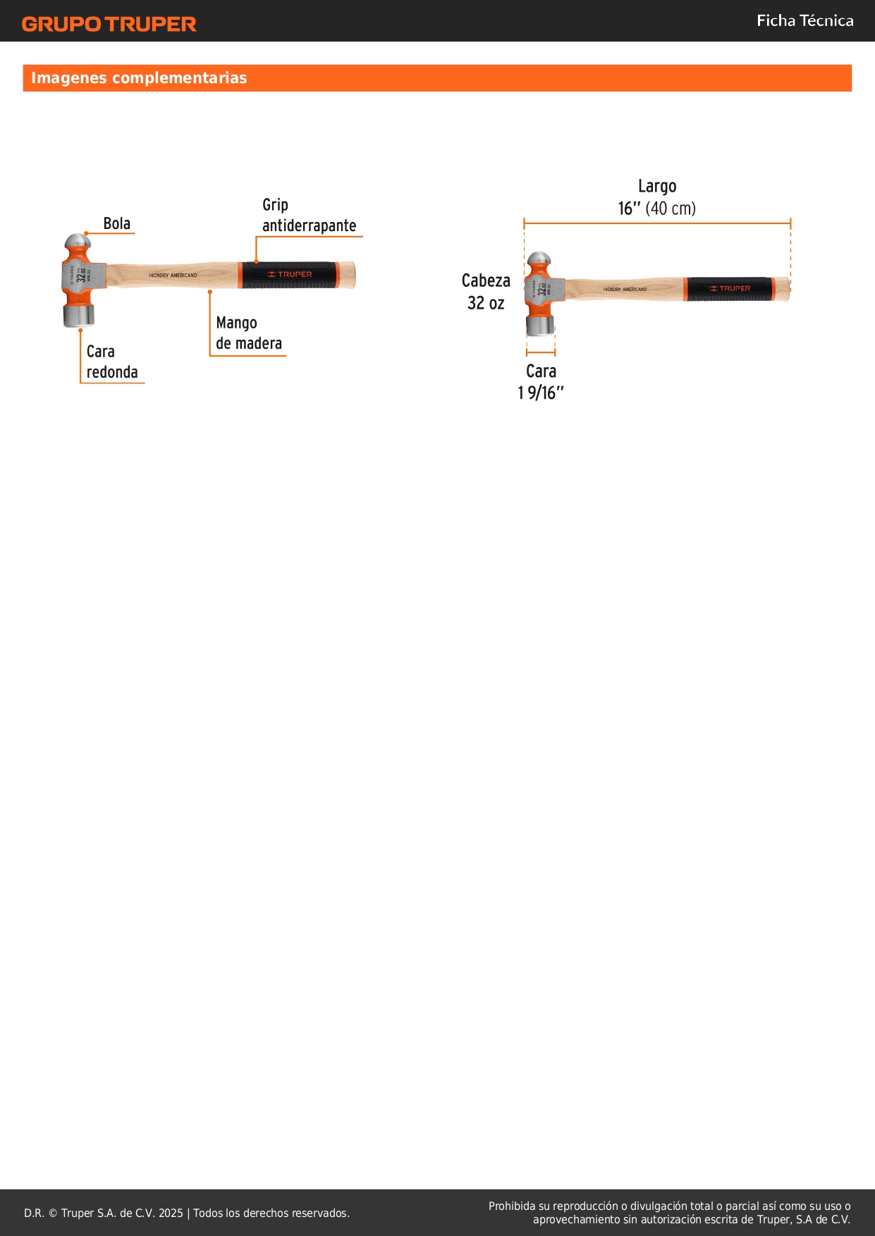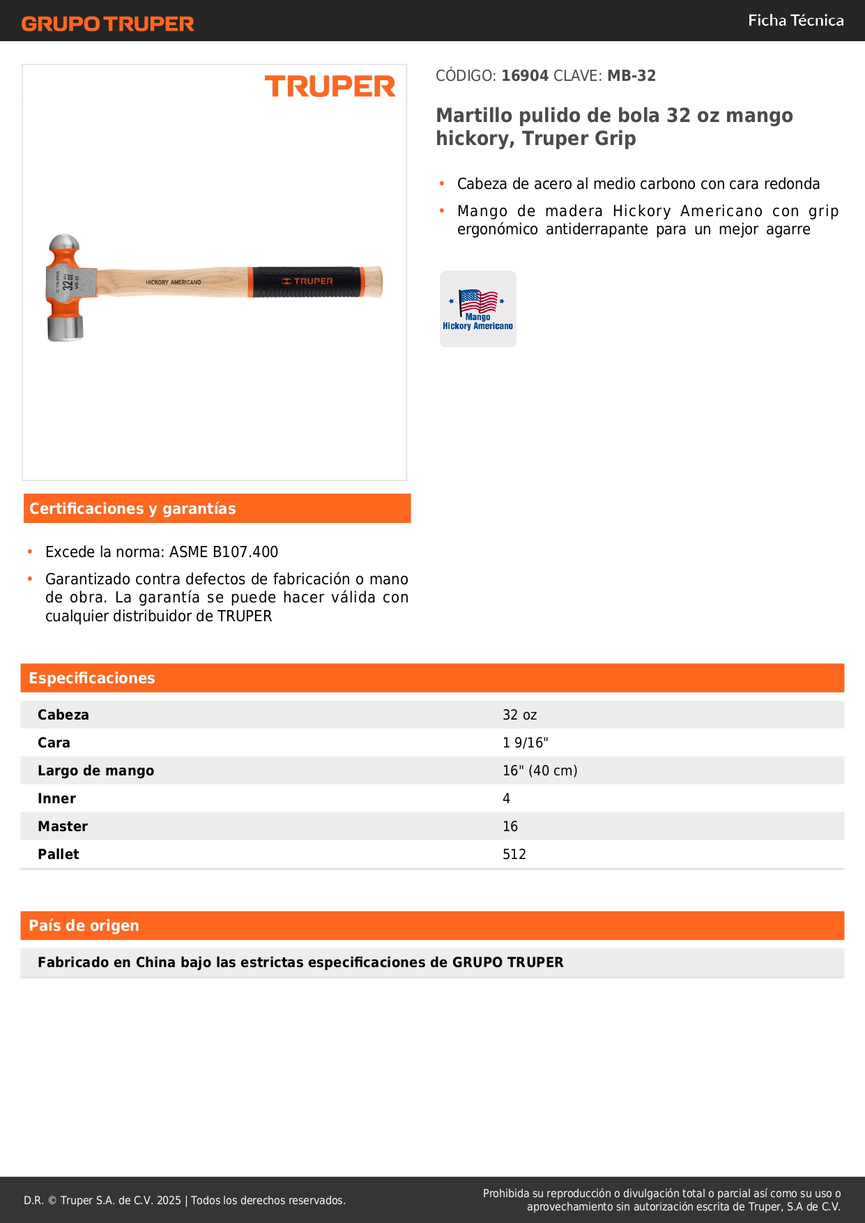 Martillo pulido de bola 32 oz mango hickory grip Truper