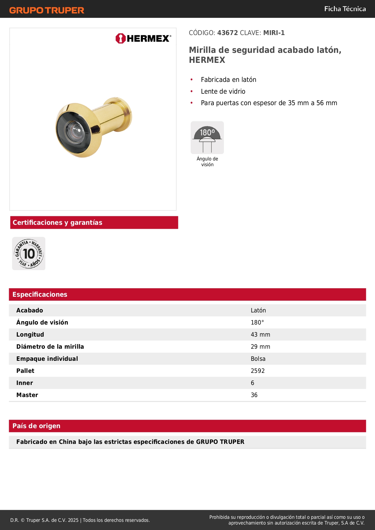 Mirilla de seguridad acabado laton Hermex