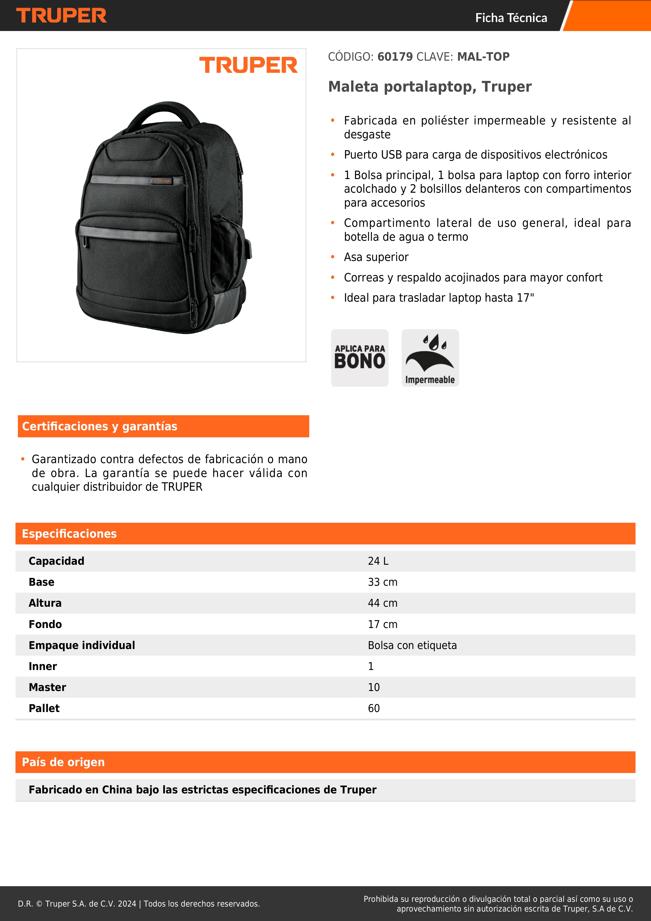 • 1 Bolsa principal, 1 bolsa para laptop con forro interior acolchado y 2 bolsillos delanteros con compartimentos para accesorios
