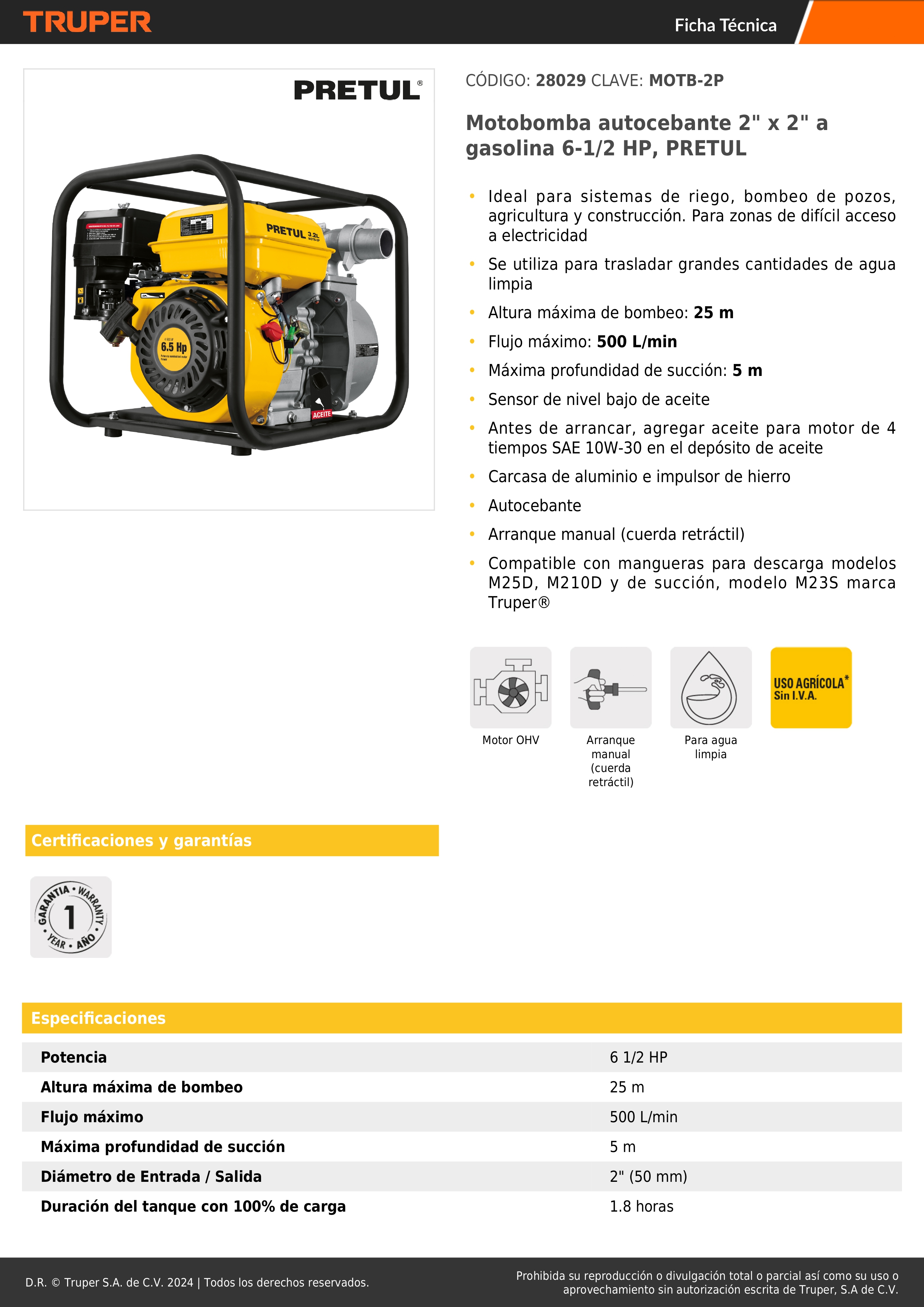 Motobomba autocebante 2" x 2" a gasolina 6-1/2 HP Pretul