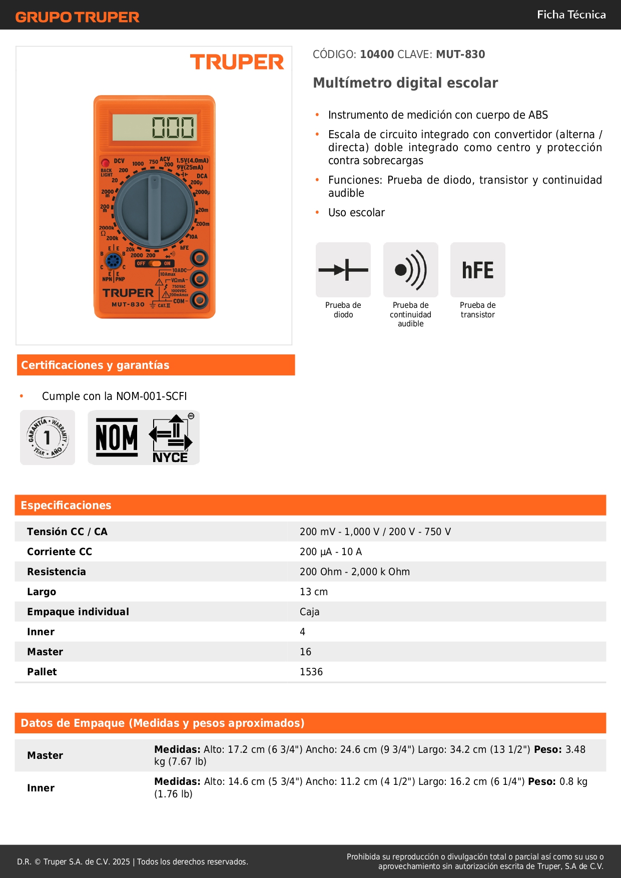 • Funciones: Prueba de diodo, transistor y continuidad audible