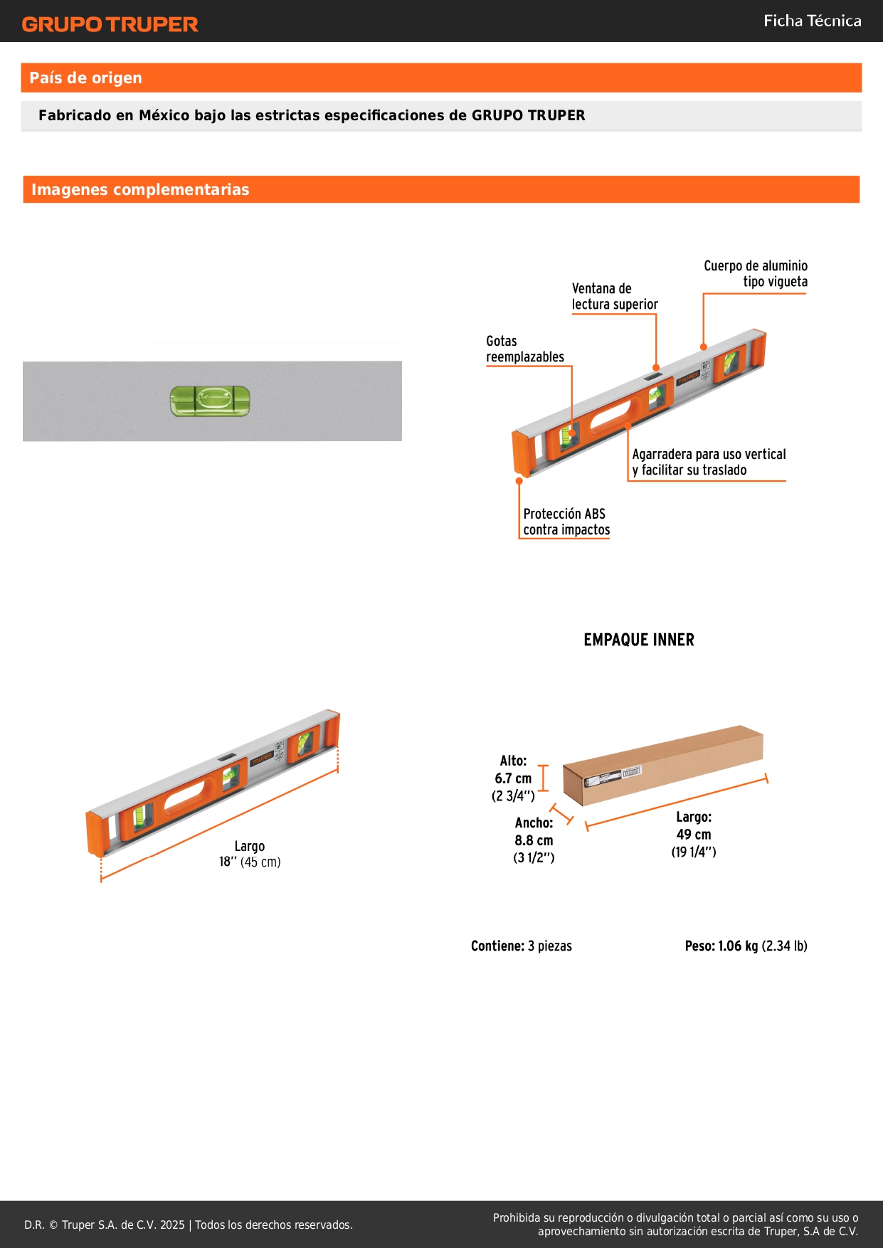 Nivel profesional de 18" con protección de ABS, Truper