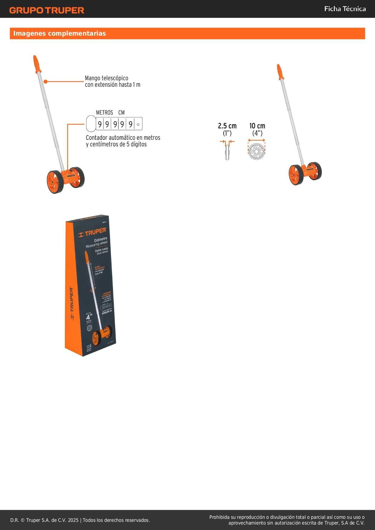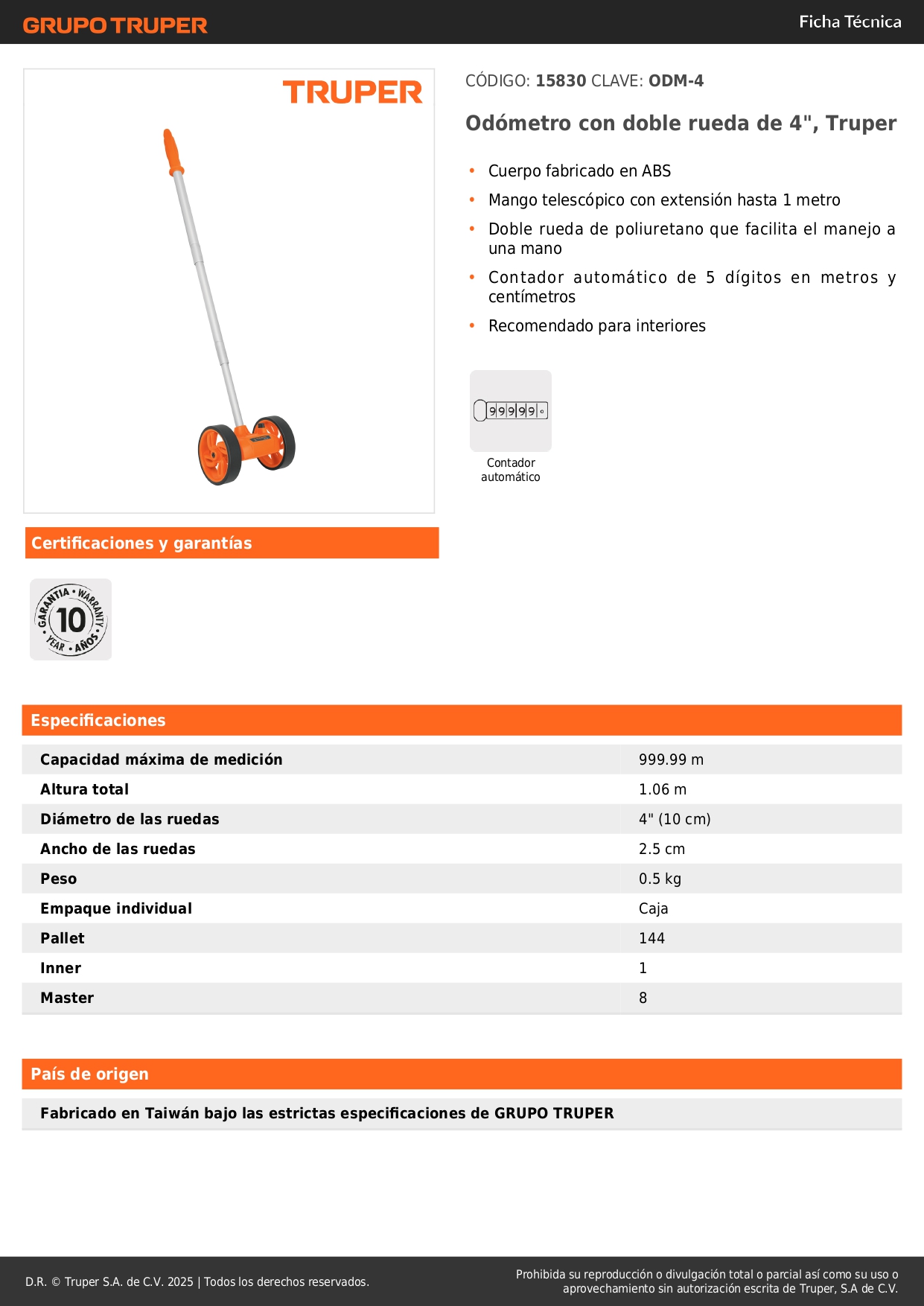 - Contador automático de 5 dígitos en metros y centímetros.