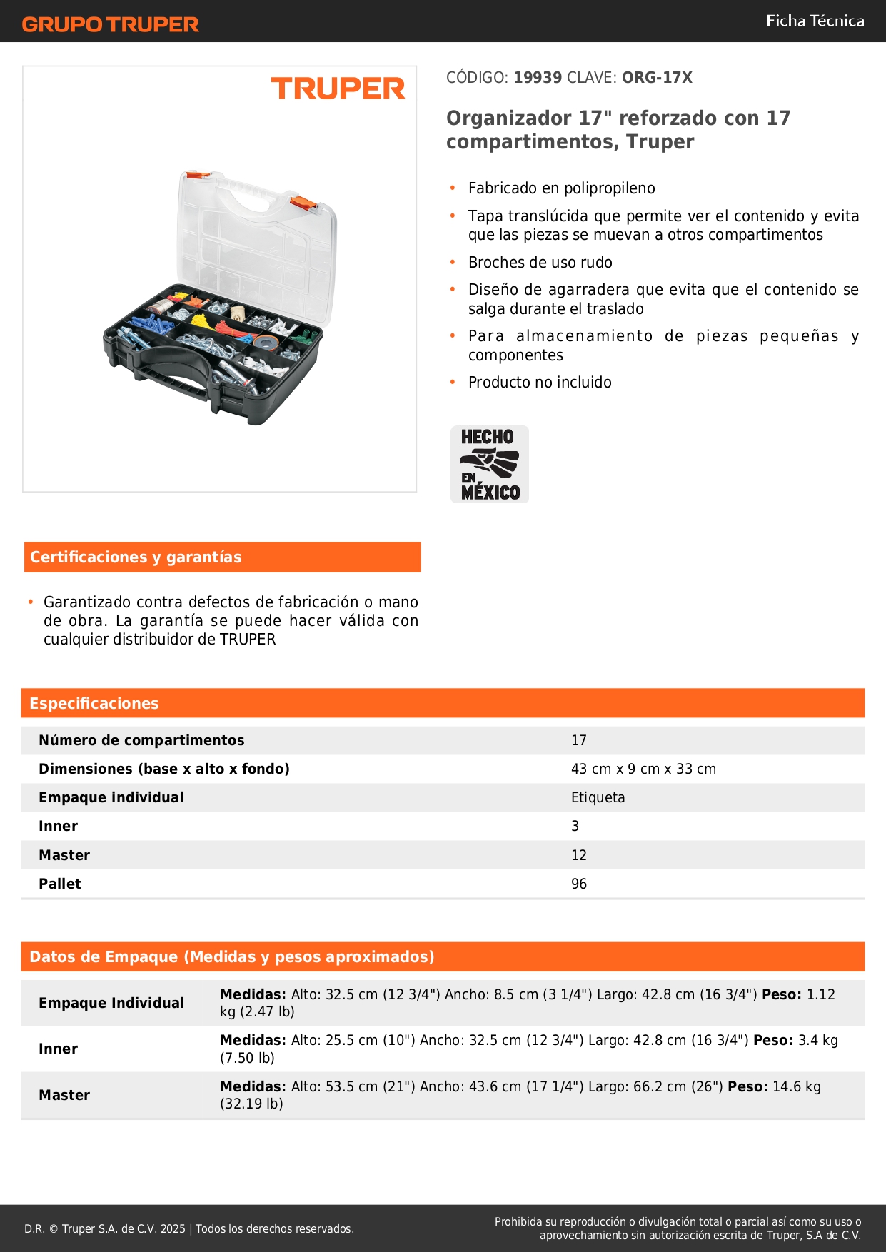 Organizador 17" reforzado con 17 compartimentos, Truper