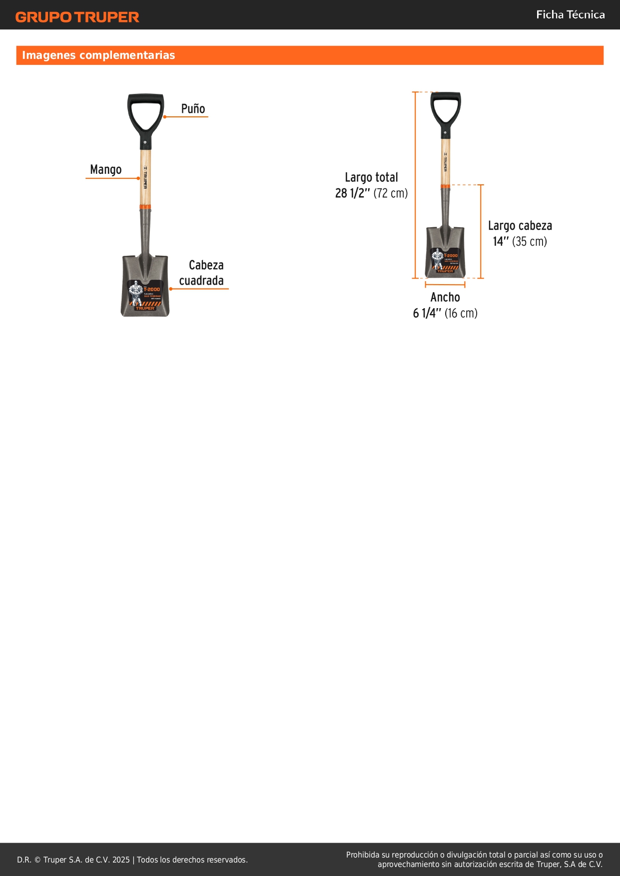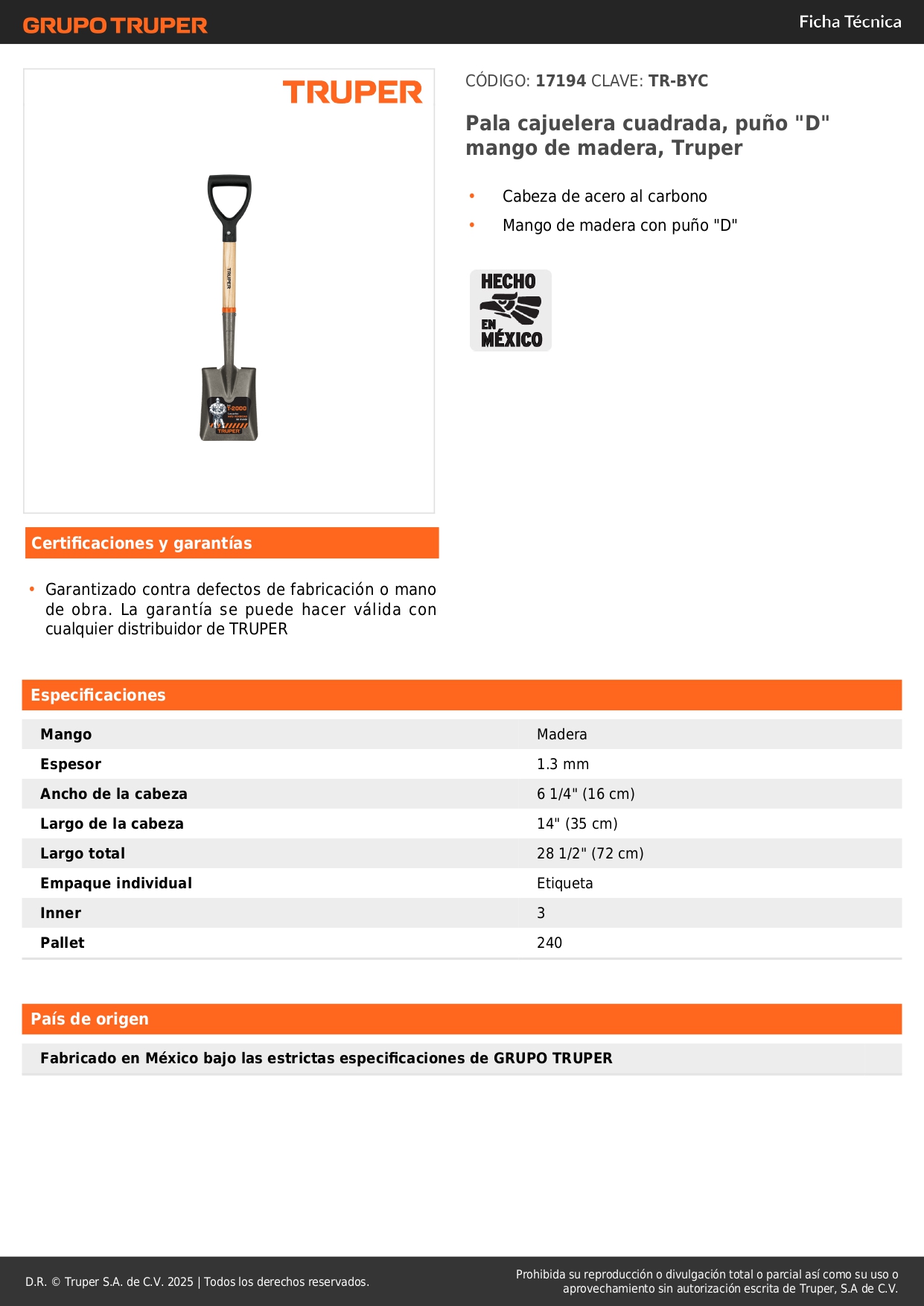 Pala cajuelera cuadrada puño "D" mango de madera Truper