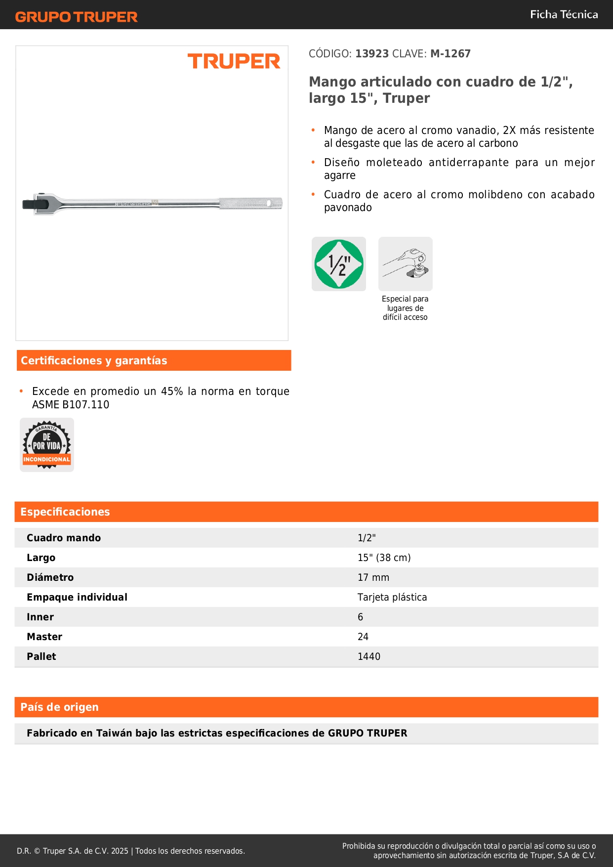 Palanca articulada de 15'' encastre 1/2'' Truper