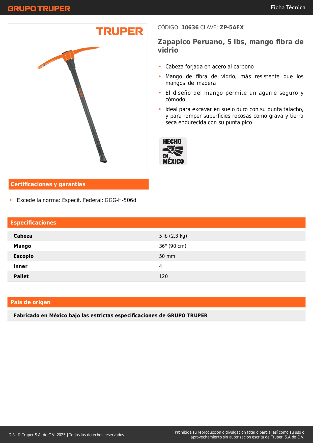 Pico peruano 5 lb con mango de fibra de vidrio de 36" Truper