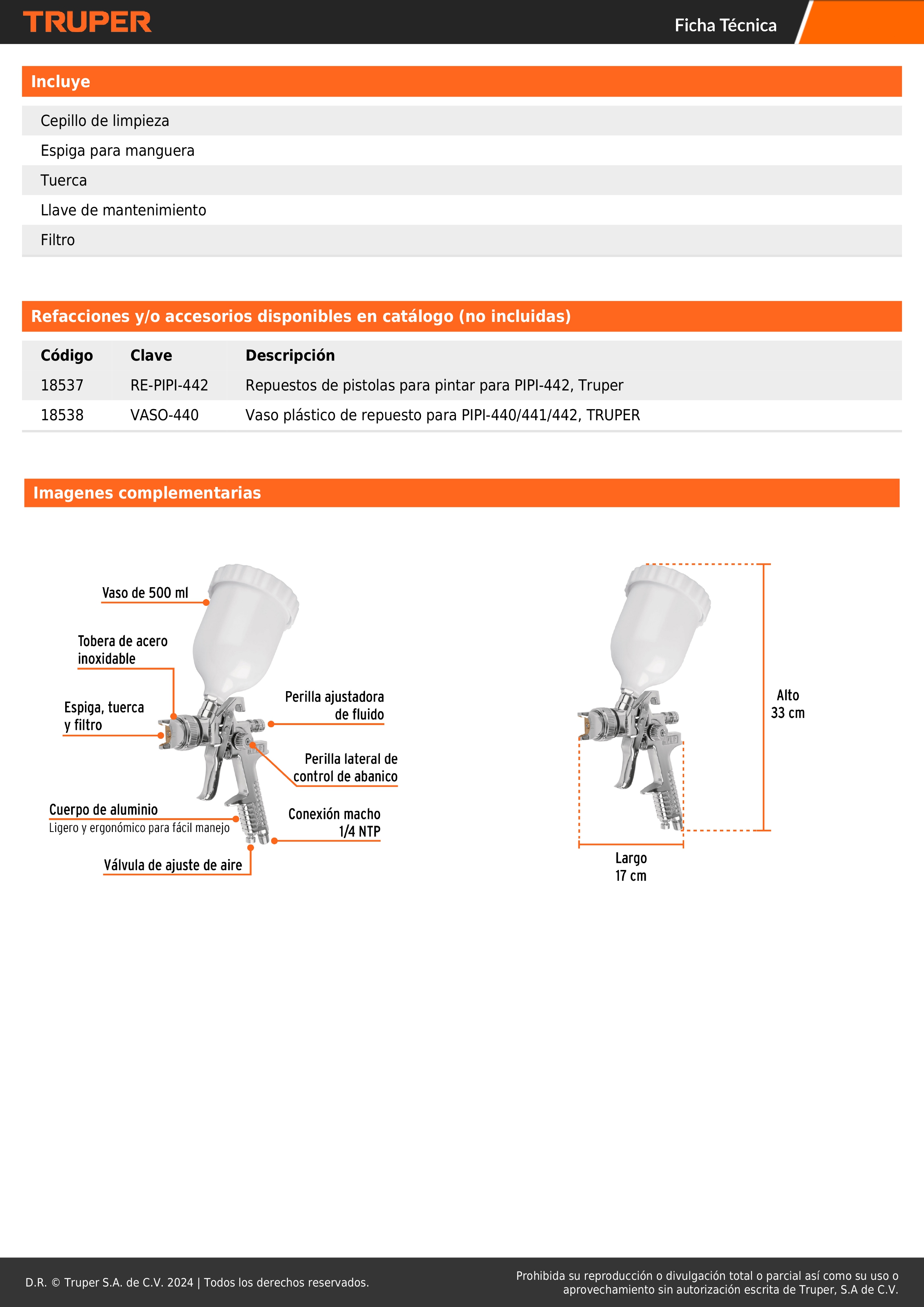 - Tobera y aguja de acero inoxidable.
