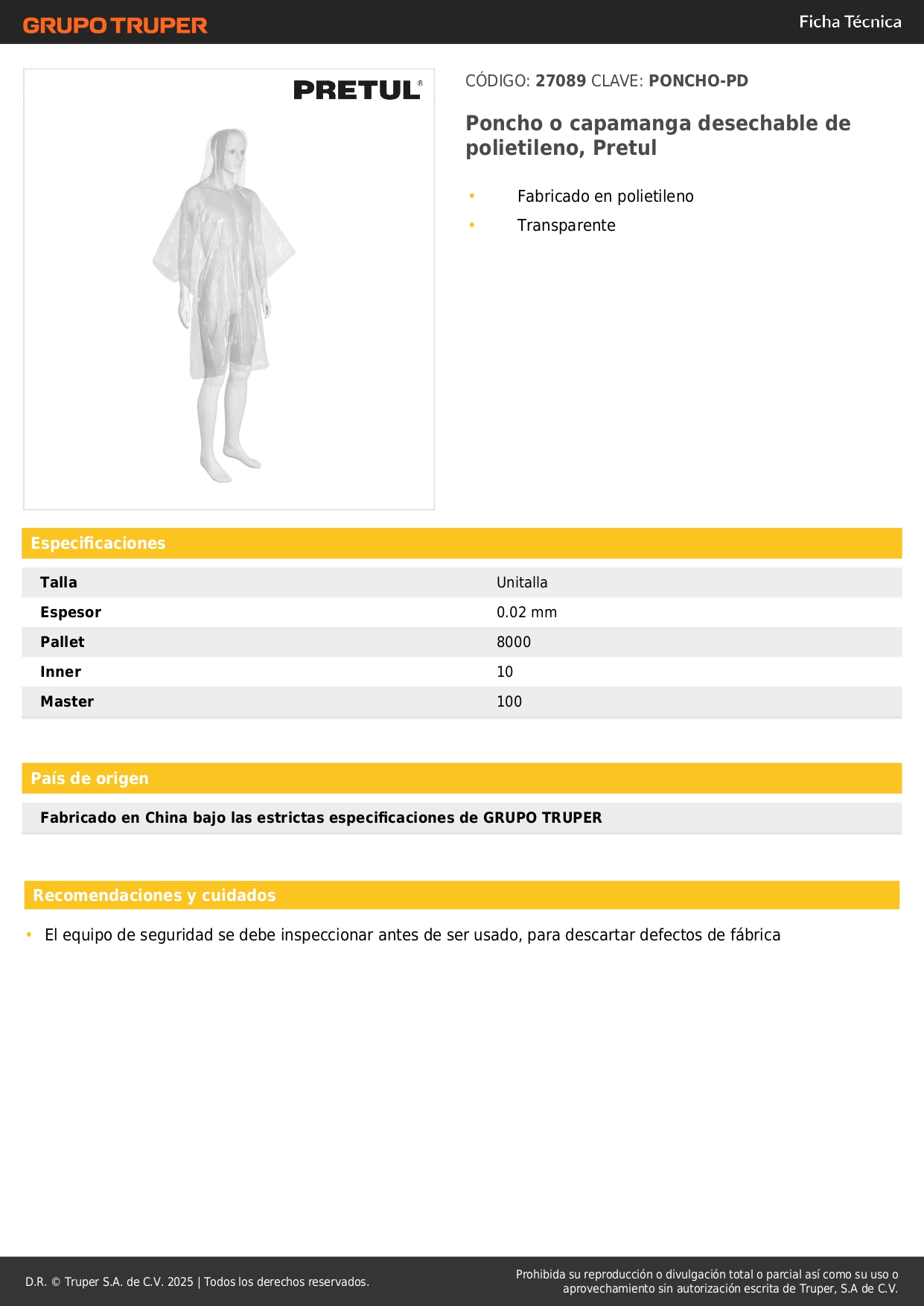 Poncho desechable, unitalla, espesor 0.02 mm, Pretul Stock por sucursal Stock por sucursal S/ 4.00 cantidad Agregar al carro Avísame cuando llegue -Fabricado en polietileno-Transparente