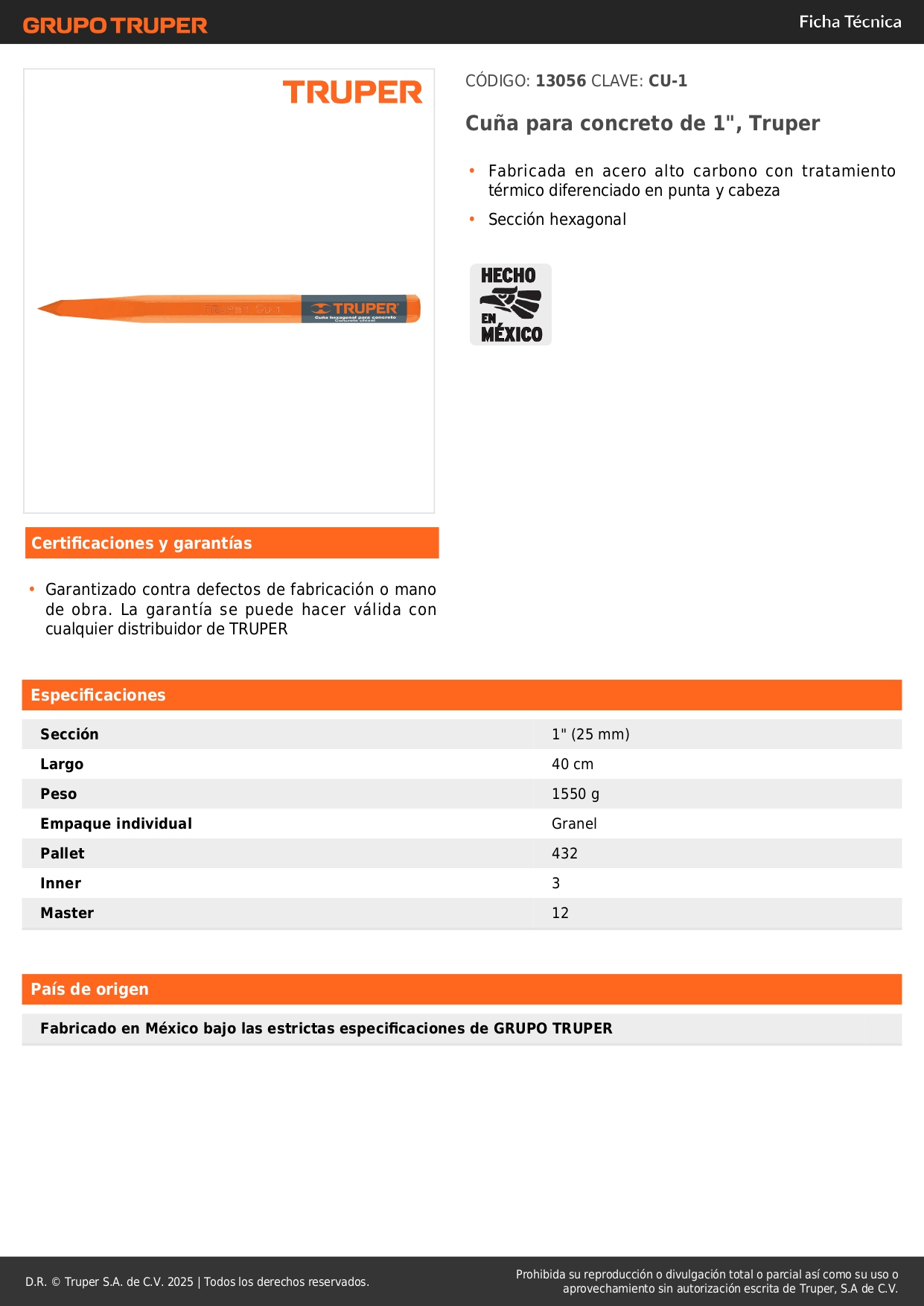 -Fabricada en acero alto carbono con tratamiento térmico diferenciado en punta y cabeza