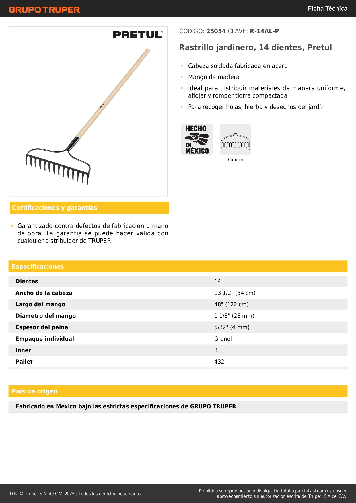 Rastrillo jardinero 14 dientes Pretul