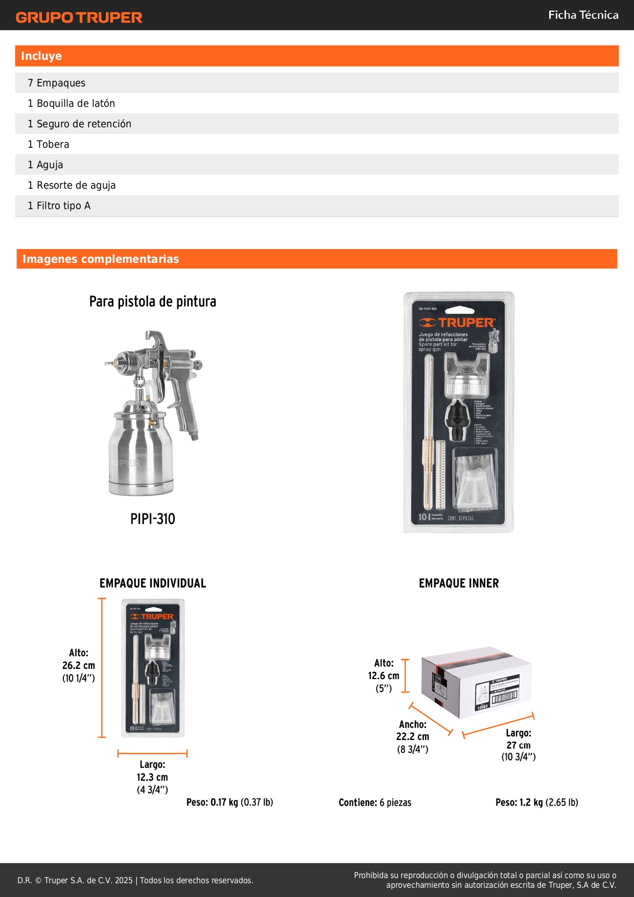 Repuestos de pistolas para pintar, PIPI-310, Truper Stock por sucursal Stock por sucursal S/ 32.40 cantidad Agregar al carro Avísame cuando llegue -Para pistola Serie 300, de succión modelo PIPI-310 marca Truper®