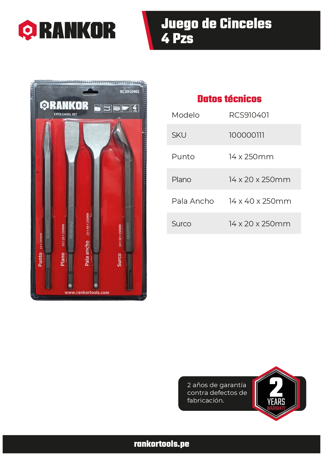 Set de cinceles SDS Plus x 4 piezas Rankor