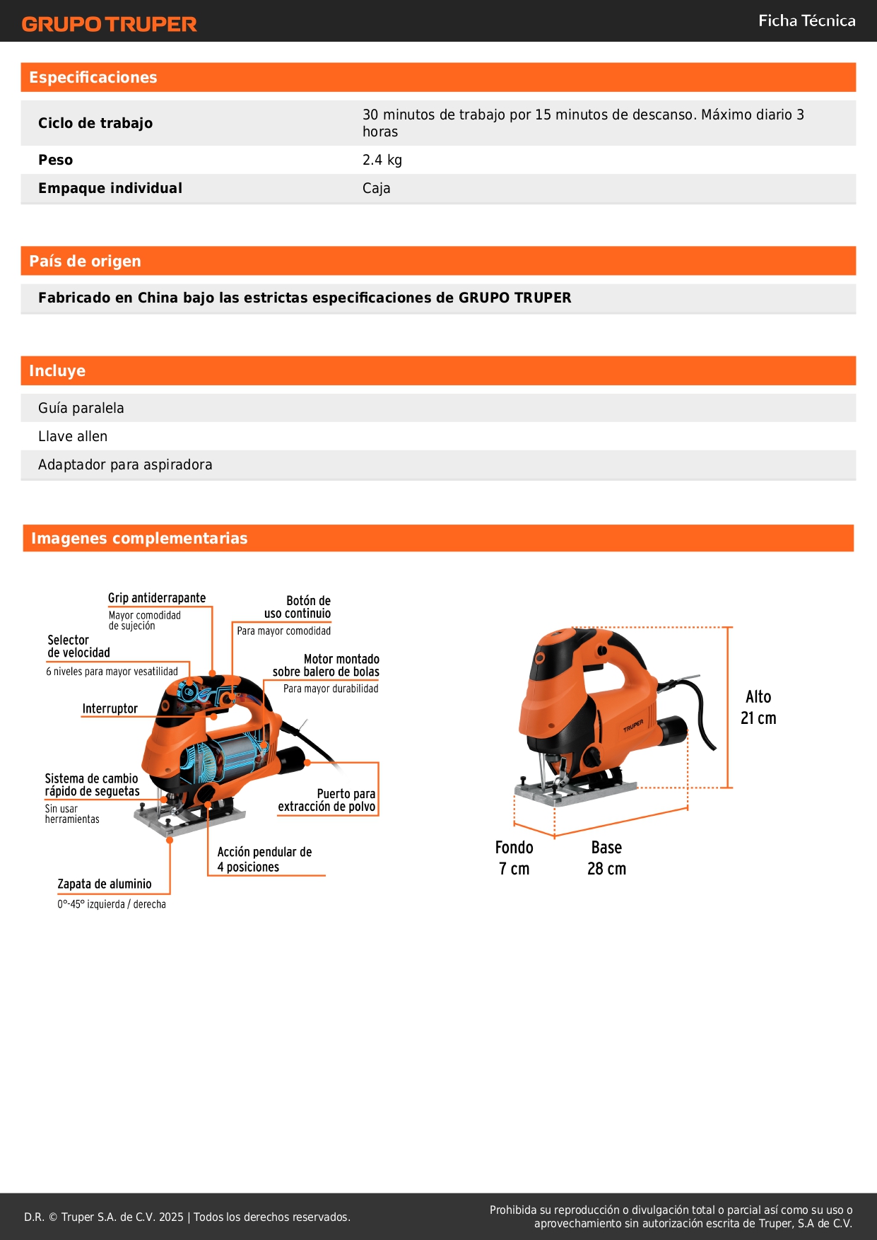 • Control de acción pendular; que varia el Angulo de corte del segueta con el fin de aumentar la eficiencia