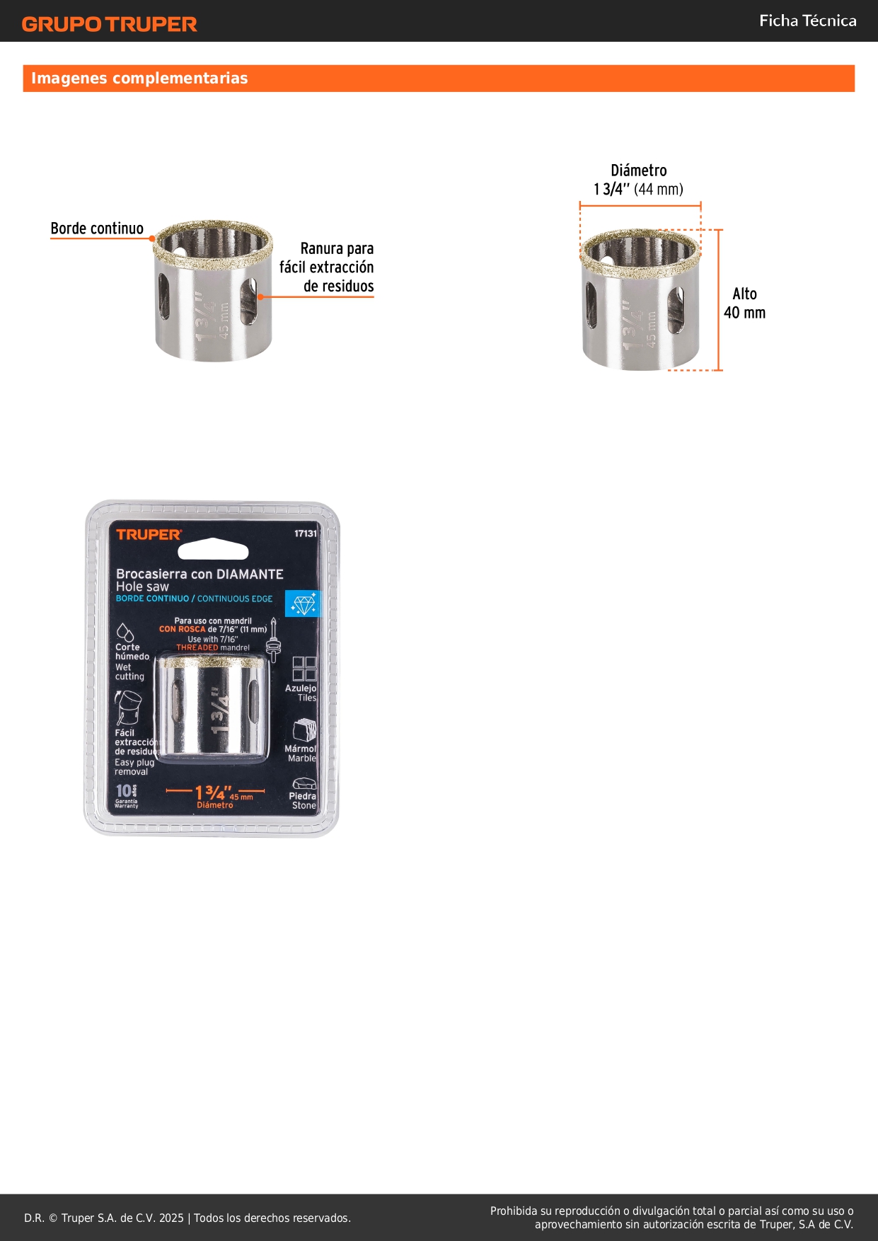 Sierra copa con diamante 1-3/4´´ borde continuo, Truper