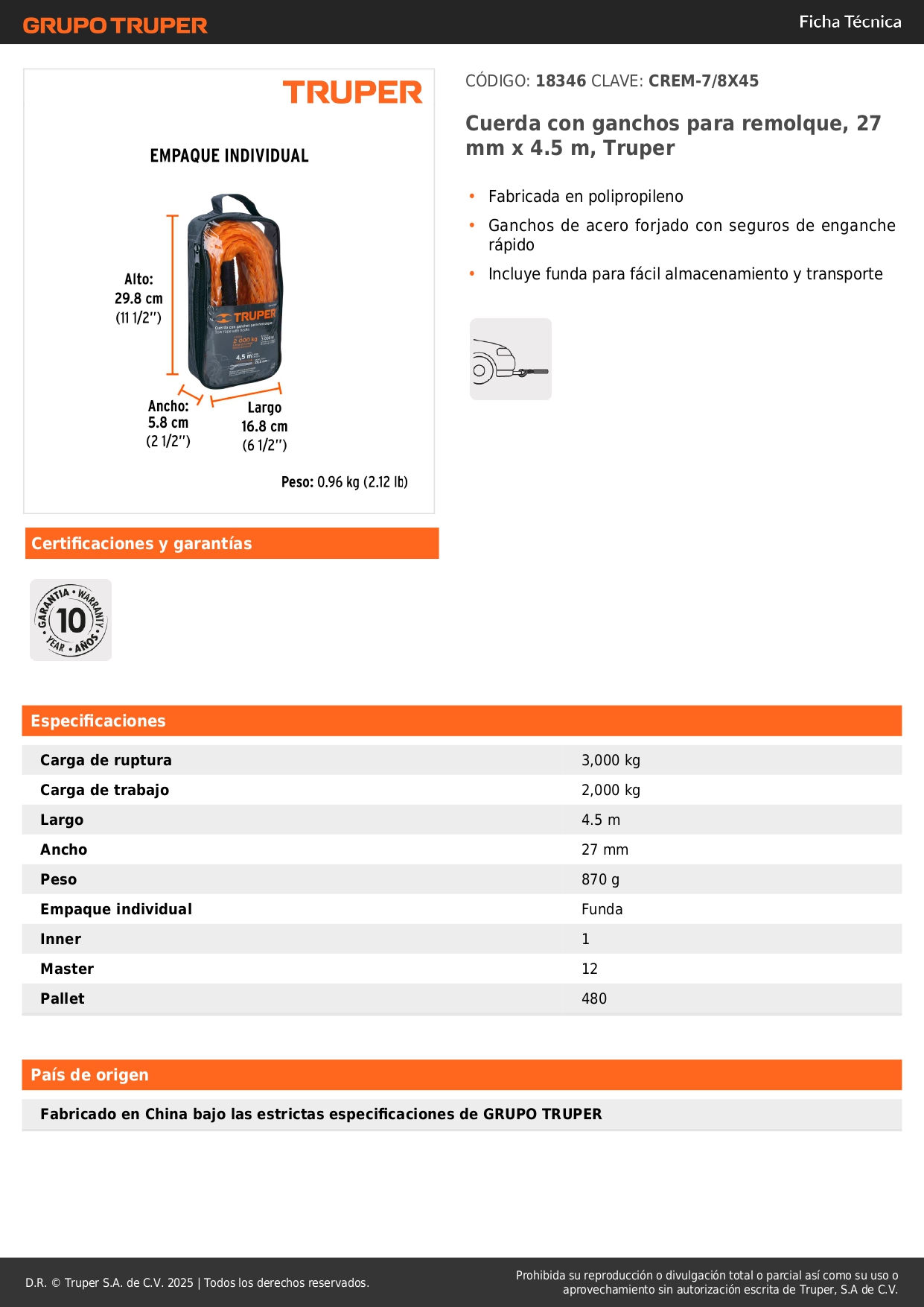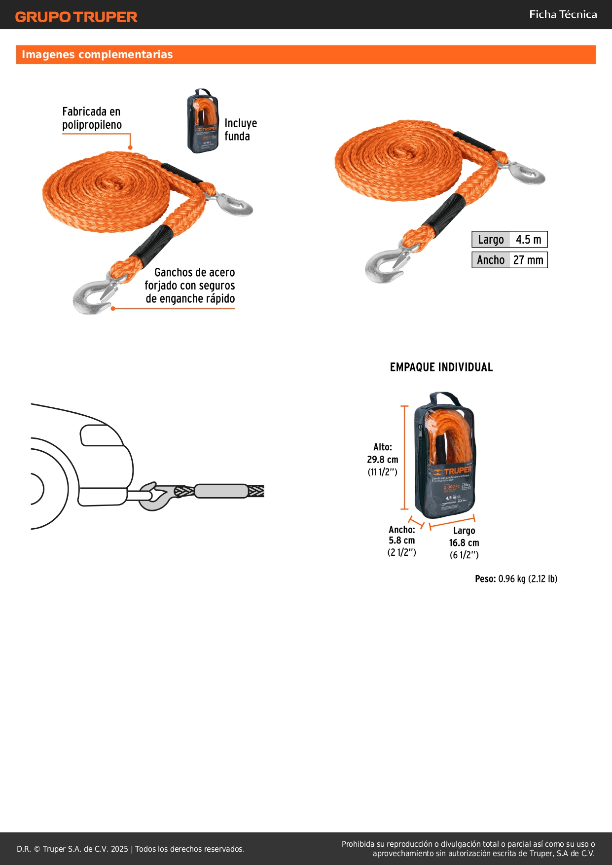 Cuerda con ganchos para remolque, 27 mm x 4.5 m, Truper