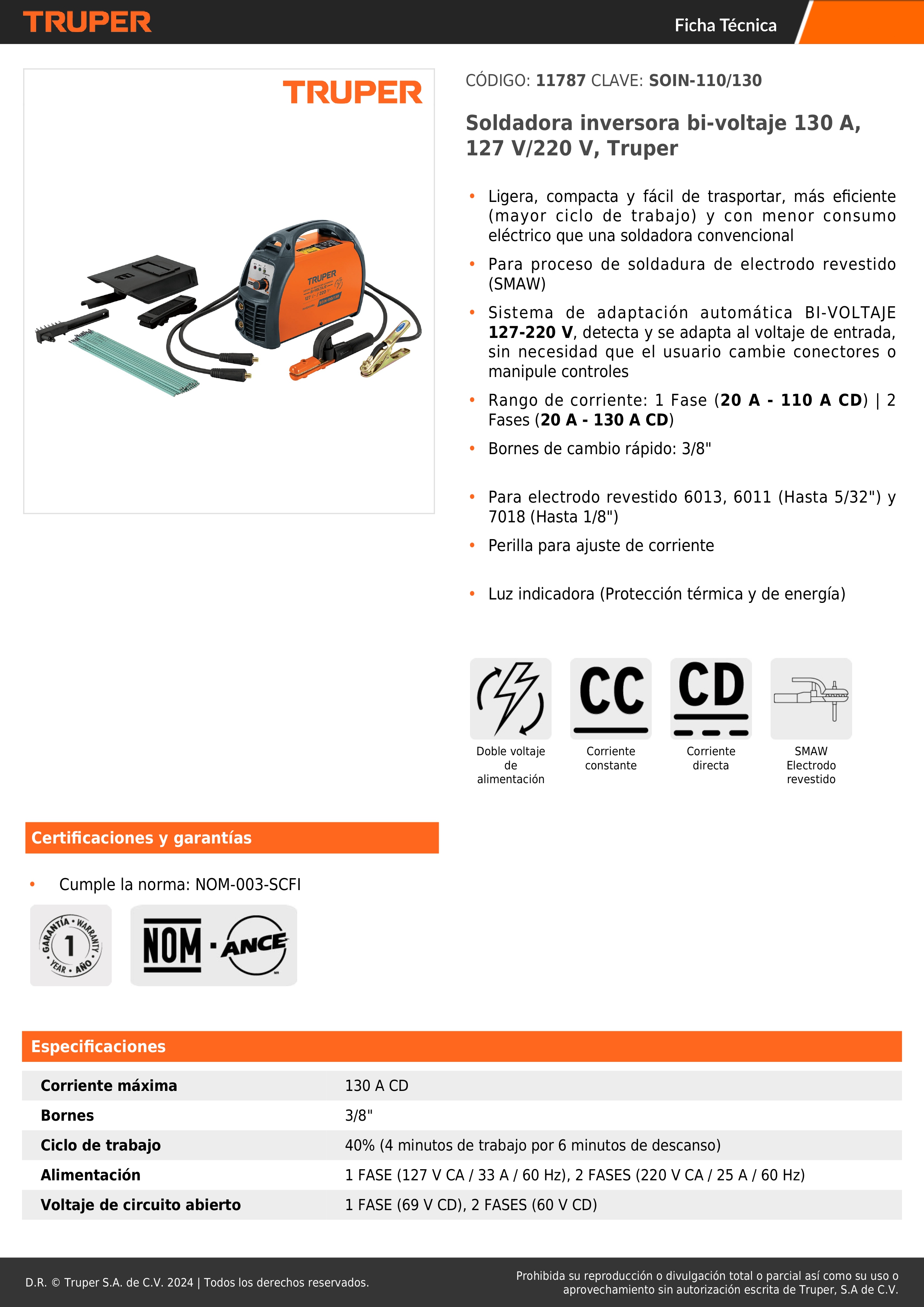 Voltaje de circuito abierto 1 FASE (69 V CD), 2 FASES (60 V CD)