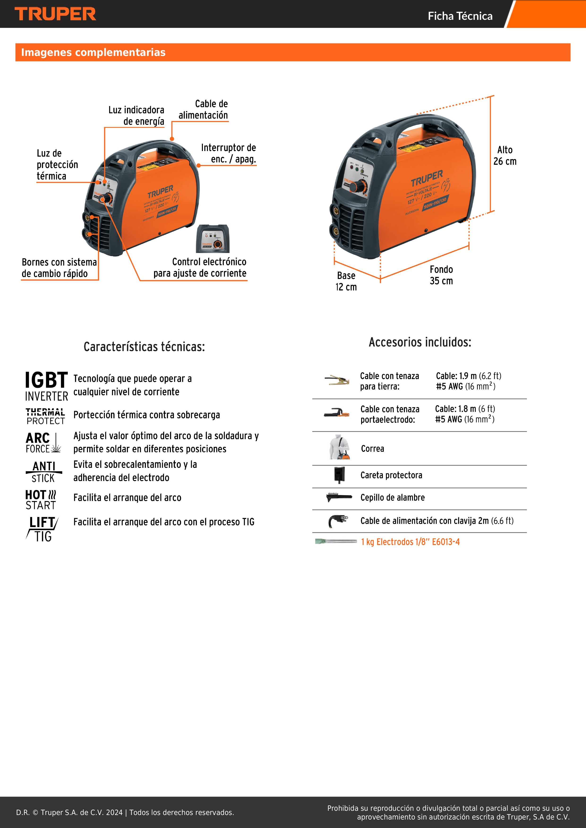Alimentación 1 FASE (127 V CA / 33 A / 60 Hz), 2 FASES (220 V CA / 25 A / 60 Hz)