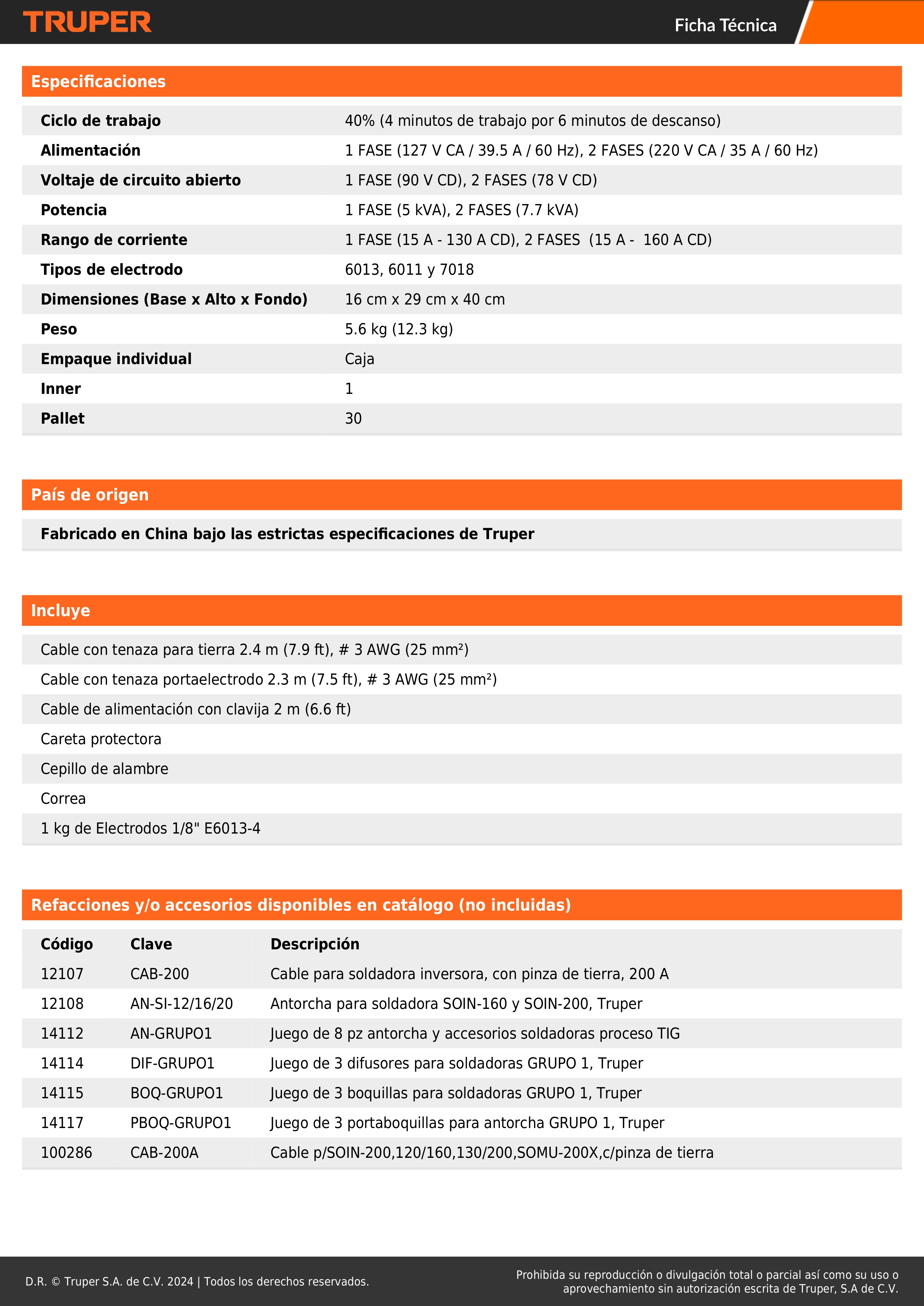 Alimentación1 FASE (127 V CA / 39.5 A / 60 Hz), 2 FASES (220 V CA / 35 A / 60 Hz)